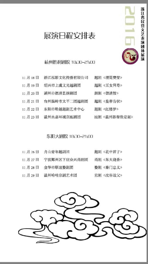 11月18日,由省文化厅和东阳市人民政府主办,浙江艺术职业学院和东阳市文化广电新闻出版局承办的2016年浙江省民营文艺表演团体展演活动将在浙江胜利剧院开幕。
