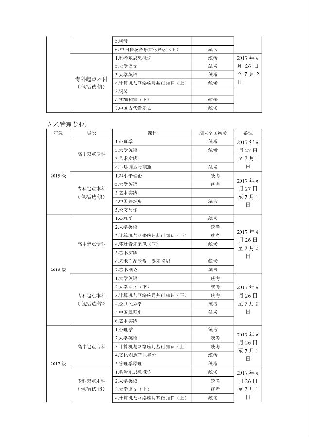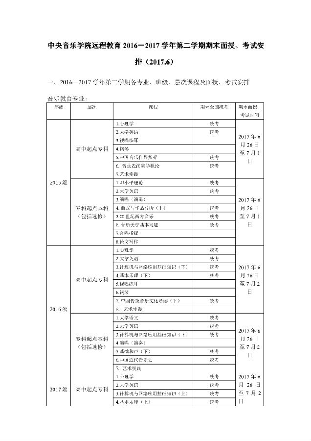 中央音乐学院远程教育2016-2017学年第二学期期末面授、考试安排(2017.6)