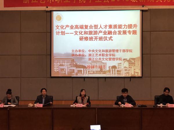 浙江艺术职业学院院长黄杭娟在开班仪式上致辞。她首先谈了对文化和旅游产业融合发展的几点认识。组建文化和旅游部是党和国家机构改革的重大决策之一,文化和旅游领域工作者的任务是要立足新时代、担当新使命,有效地把党中央关于文化和旅游融合发展的各项决策部署落到实处;旅游的优势主要体现在市场,文化的优势主要体现在内涵,这两大产业可以相互融合、相得益彰,共同繁荣发展;浙江的宋城千古情、东阳横店影视城等成功案例告诉我们,让文化牵手旅游、把文化基因注入旅游资源,更有利于实现良性循环、合作增值。黄杭娟还向参训学员介绍了学院办学历史、文化人才队伍培训工作情况和本次培训班筹备情况。