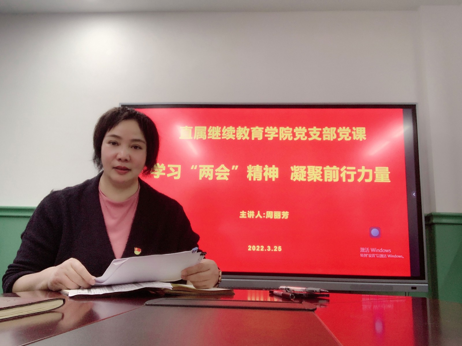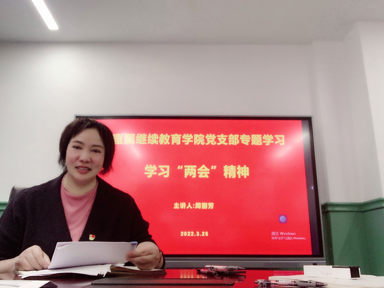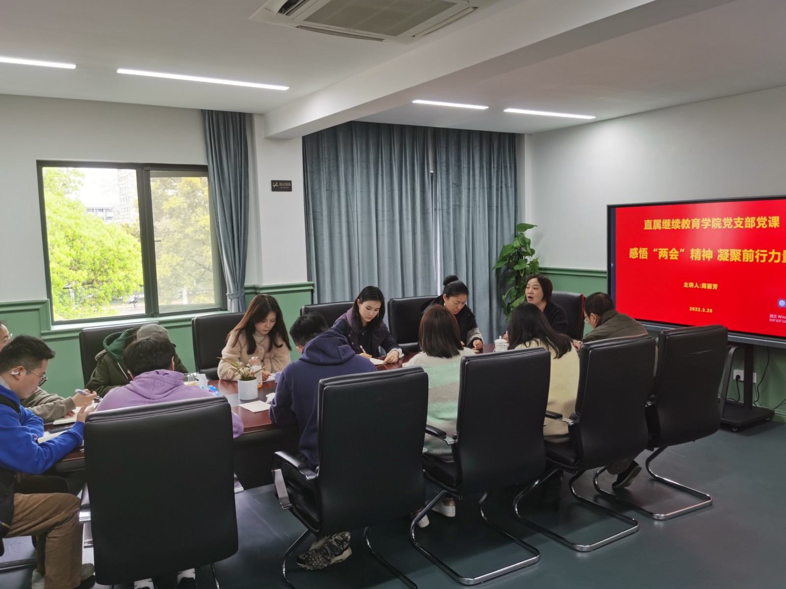 为深入贯彻学习2022年全国“两会”会议精神,正确领悟习近平总书记重要讲话精神,切实增强全体教职工责任感、使命感和紧迫感,3月25日下午,直属继续教育学院党支部聚焦两会精神,组织党员干部和全体教职工开展了两会专题学习和主题党课,并进行了两会知识竞赛活动。