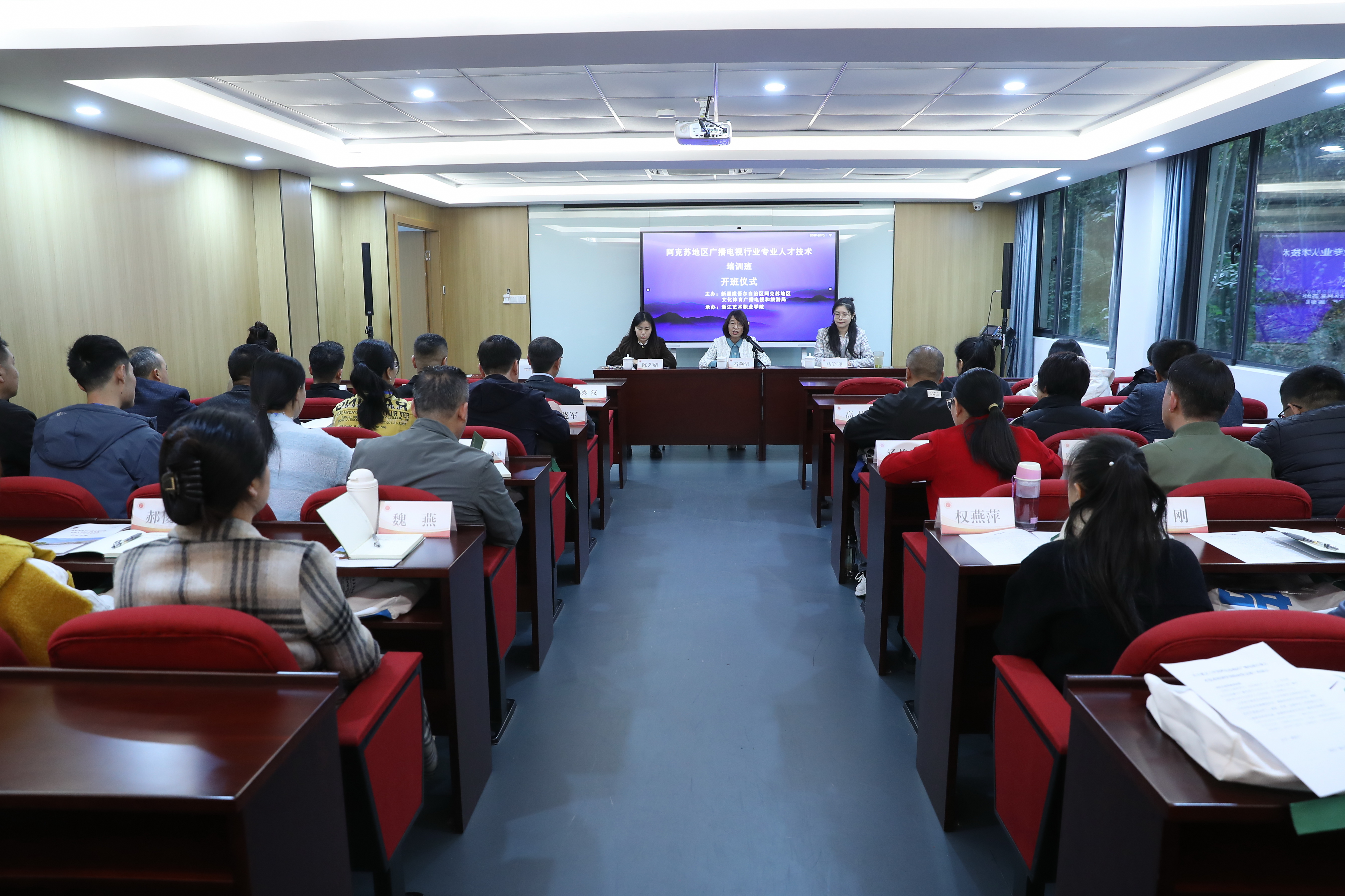 阿克苏地区文旅局四级调研员石燕青作开班动员。她首先代表阿克苏地区文化体育广播电视和旅游局向浙江艺术职业学院的辛勤付出和周到安排表示感谢,向给予阿克苏地区关心、支持和帮助的浙江省各级领导和专家们致以诚挚的问候。她表示,本次主要目的是搭建一个相互了解、精度充电、交流提升的学习平台,培养一支政治素质高、专业技能强、服务水平好的高素质人才队伍,激发大家干事创业的工作热情,为阿克苏地区广播电视事业发展注入新的生机与活力。她从“立足实际,提高站位,充分认识开展此次培训的重要意义”“珍惜机会,认真学习,为阿克苏地区广播电视发展作出积极贡献”“端正态度,严肃纪律,确保培训取得实效”三个方面展开动员讲话。