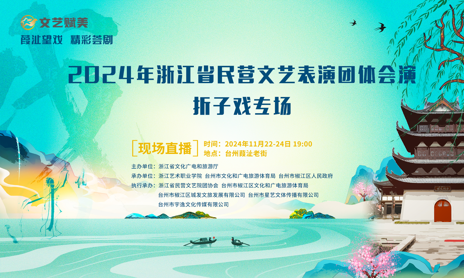 本次会演由浙江省文化广电和旅游厅主办,浙江艺术职业学院、台州市文化和广电旅游体育局、台州市椒江区人民政府承办,浙江省民营文艺院团协会、台州市椒江区文化和广电旅游体育局、台州市椒江区城发文旅发展有限公司、台州市星艺文体传播有限公司、台州市宇逸文化传媒有限公司执行承办。