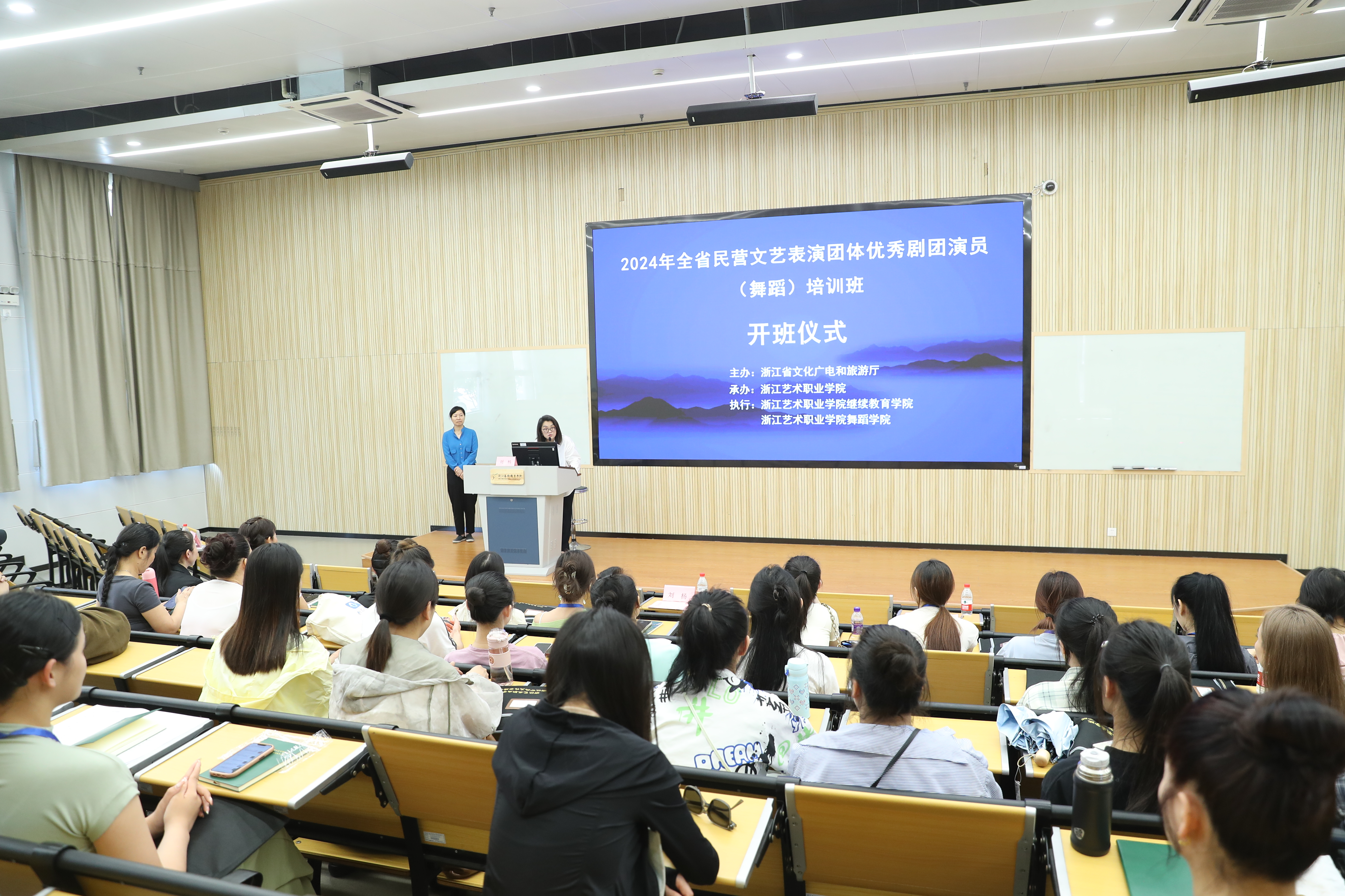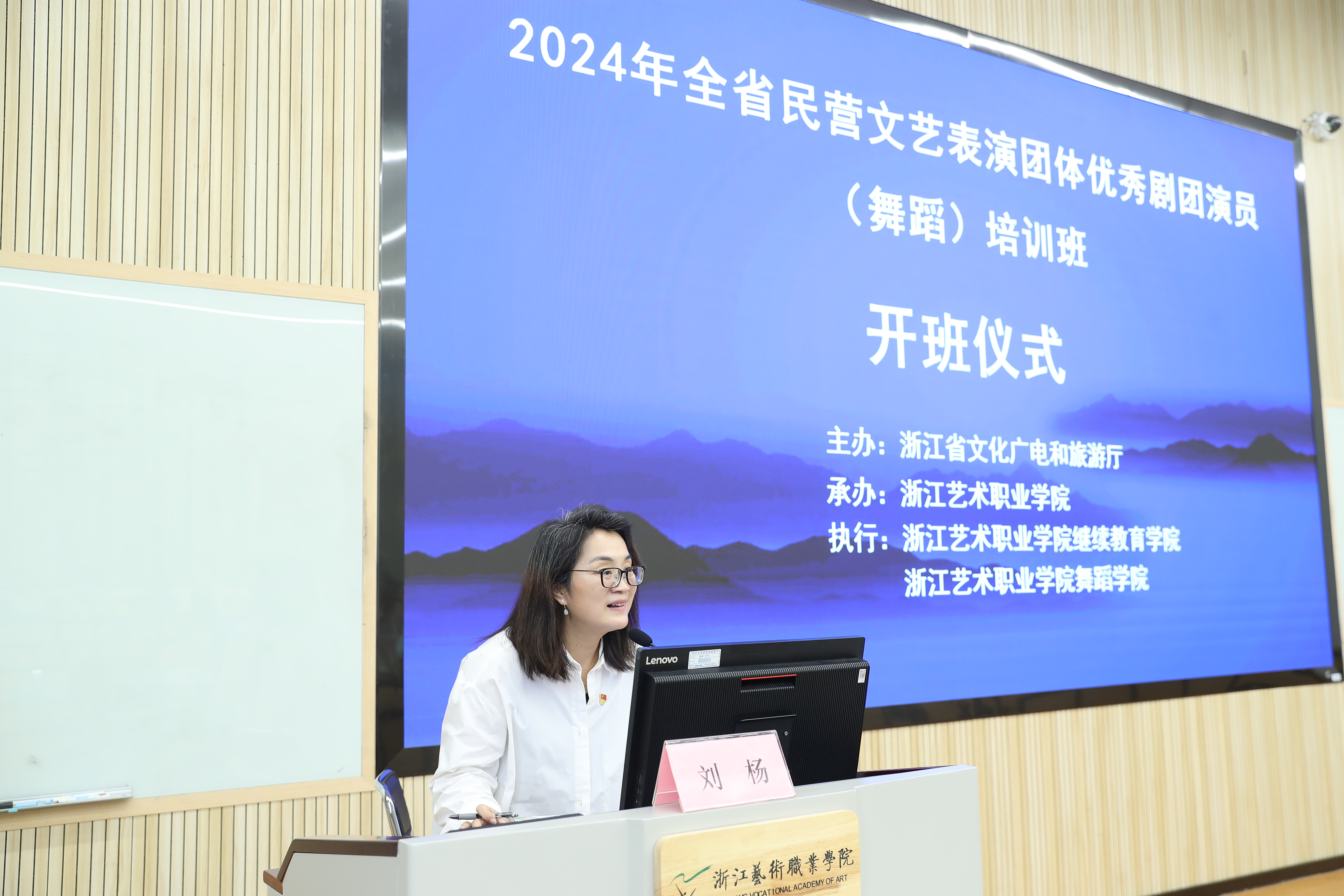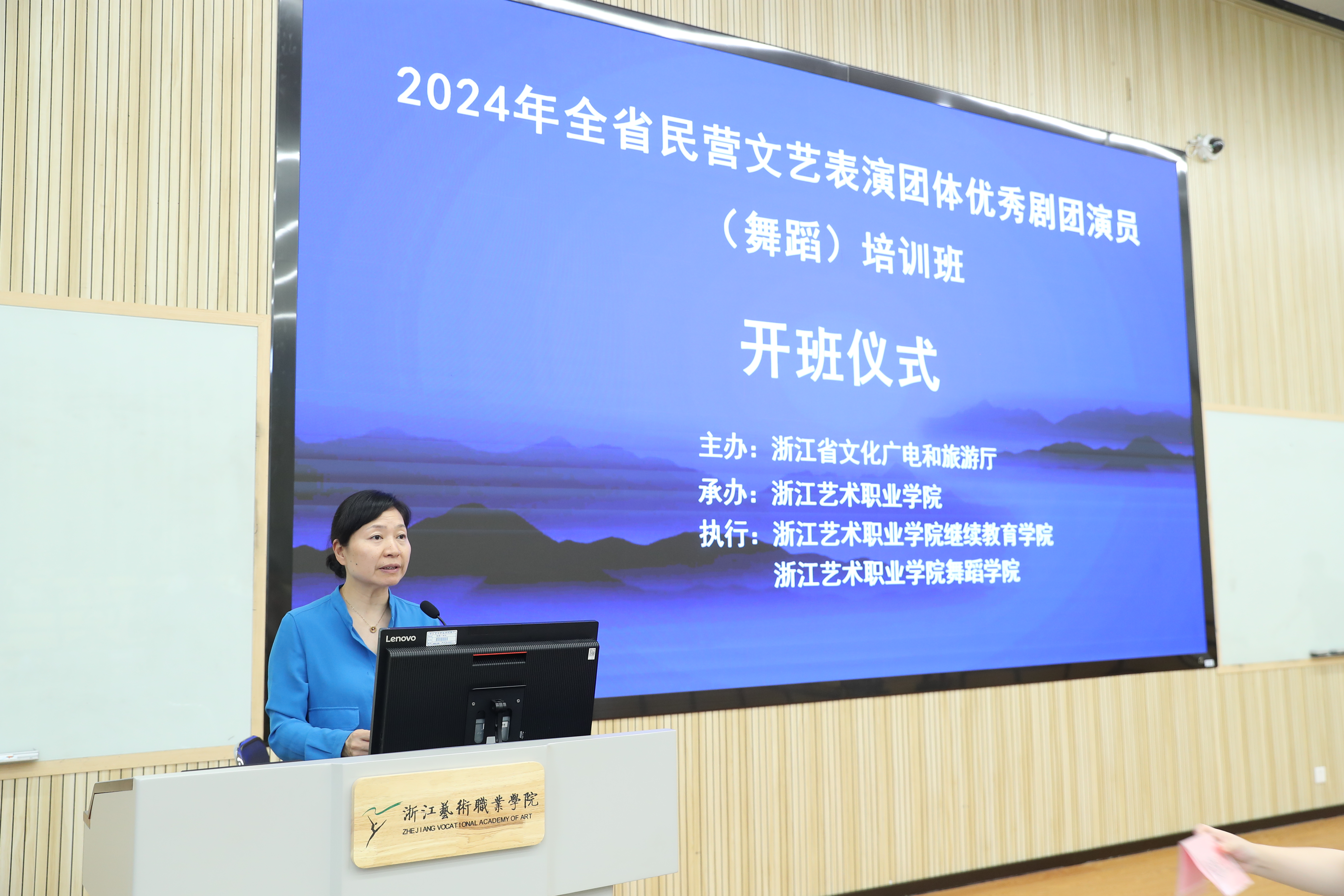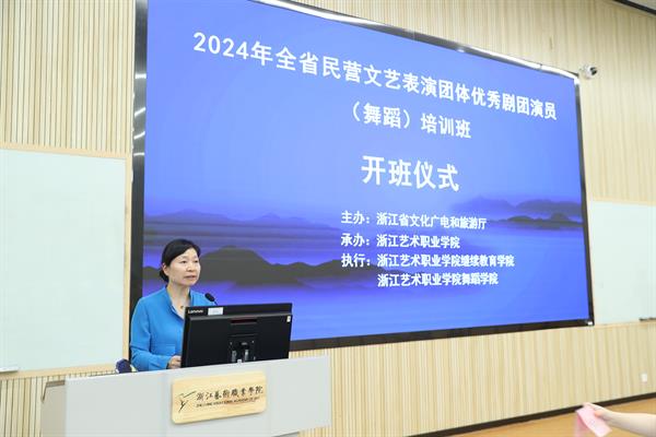 7月4日,由浙江省文化广电和旅游厅主办、浙江艺术职业学院承办、浙艺舞蹈学院和继续教育学院共同执行承办的全省民营文艺表演团体优秀剧团演员(舞蹈)培训班在我校开班,来自全省各地民营文艺表演团体的40名学员参加培训。我校党委委员、副校长刘杨,继续教育学院院长吴灌红出席开班仪式。仪式由吴灌红主持。