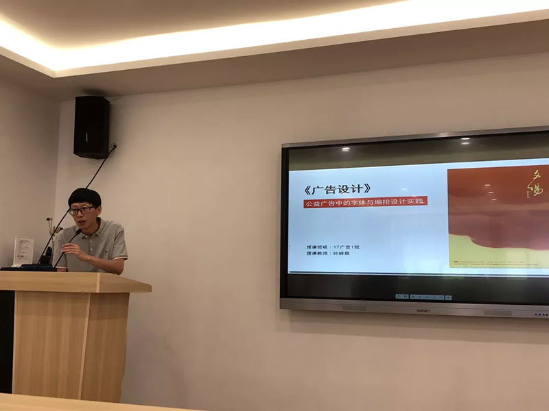 《广告设计》课程以一堂具体的教学实践课来讲述广告设计中如何让学生学会汉字设计,让汉字字体设计风格和广告图形风格相融合,从而形成汉字之美。他以学生参加全国大中学生第八届海洋文化创意设计大赛的作品为例,引出教学中强调汉字在设计作品中的应用的重要性,引导学生多用汉字,而不是直接用英文做设计,让学生明白汉字是中华文化的独特符号,必须要坚持汉字文化,用汉字做设计是未来设计教学的正确方向。