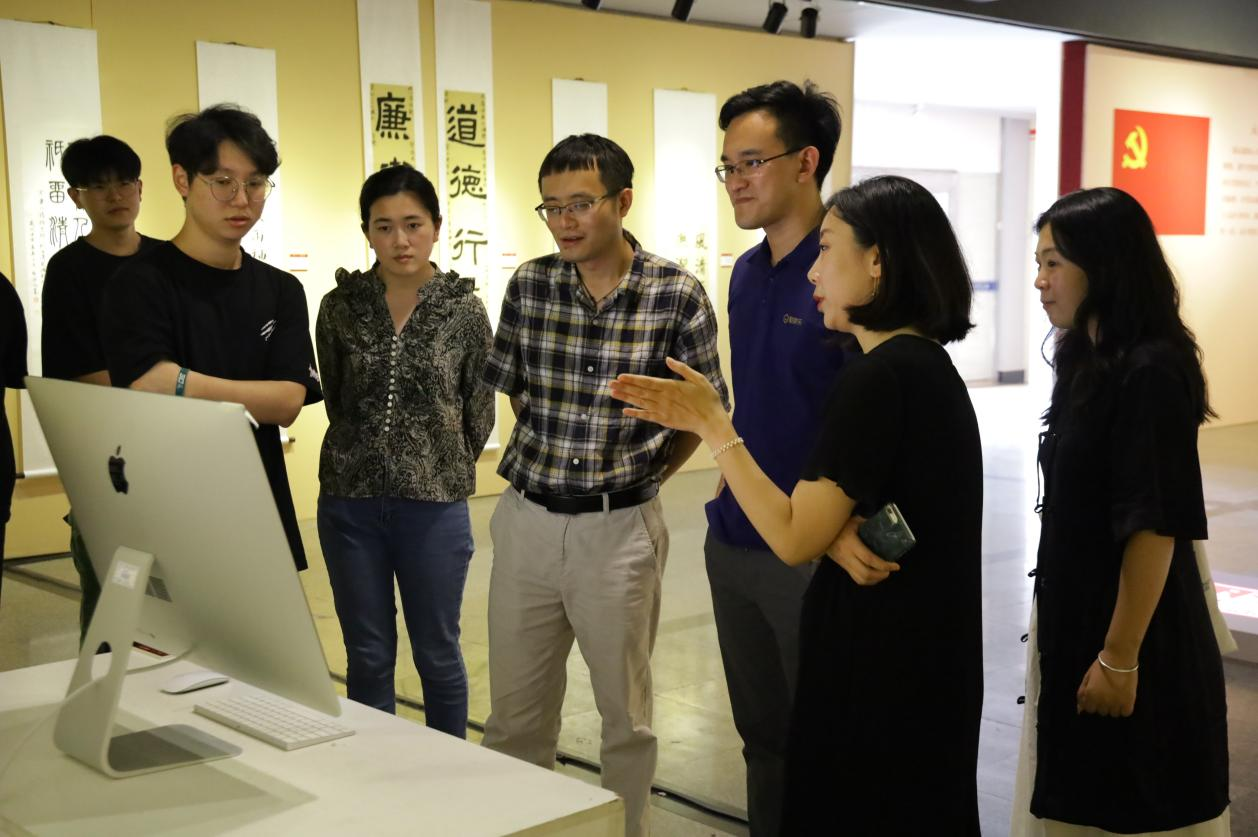 杭州群核信息技术有限公司一行首先来到设计学院一楼展厅参观了“喜迎二十大·清廉浙艺风”廉洁艺术作品展。朱皓一行对展厅现场环境艺术设计专业学生用VR设备展示的空间设计作品,给予了高度评价。