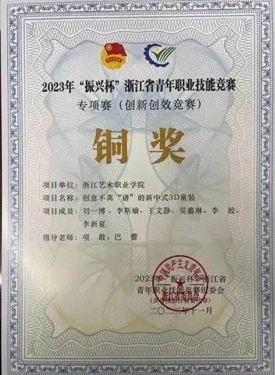 近日,由共青团浙江省委、浙江省人力资源和社会保障厅联合举办的2023年“振兴杯”浙江省青年职业技能竞赛专项赛(创新创效竞赛)落下帷幕。经过激烈的角逐,我院由服装与服饰设计专业教师项敢、巴蕾老师指导学生刘一博、李斯瑜、王文静、吴嘉琳、李姣、李新夏的作品《创意不离“谱”的新中式3D童装》参加此次大赛,并在比赛中荣获铜奖。