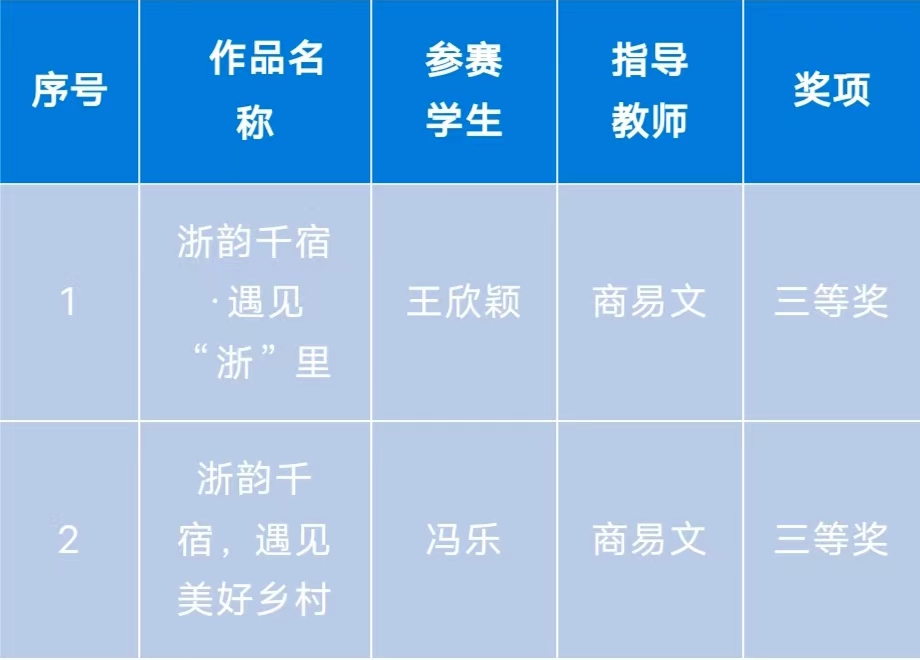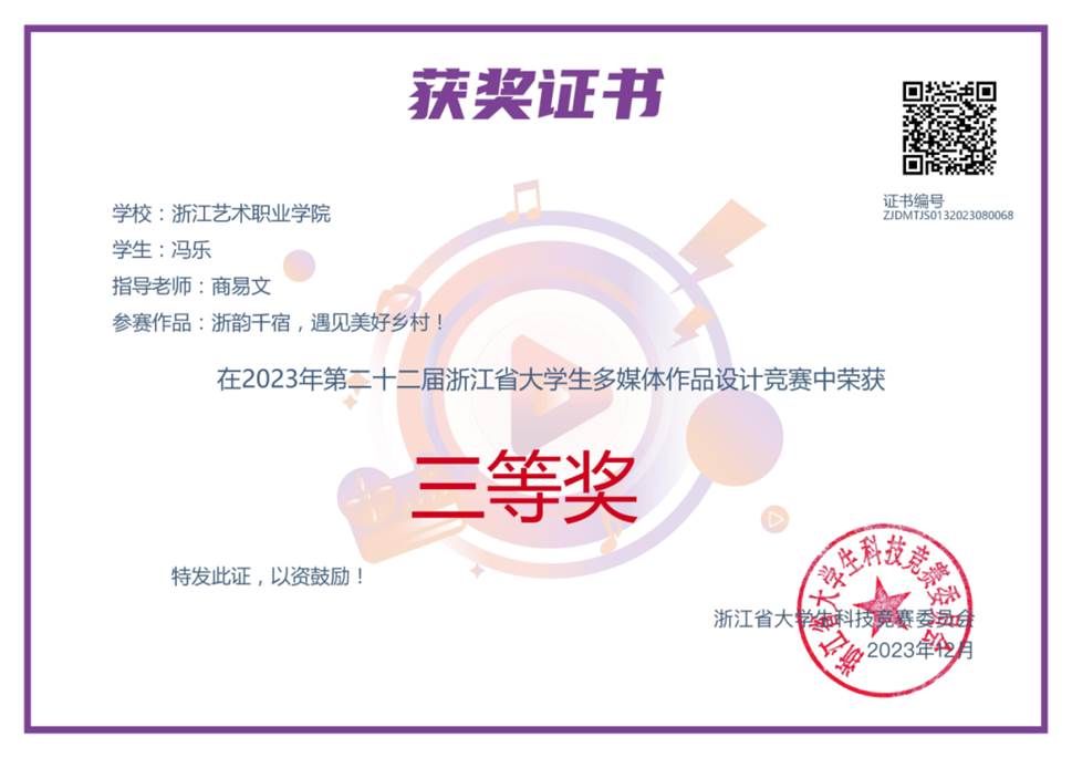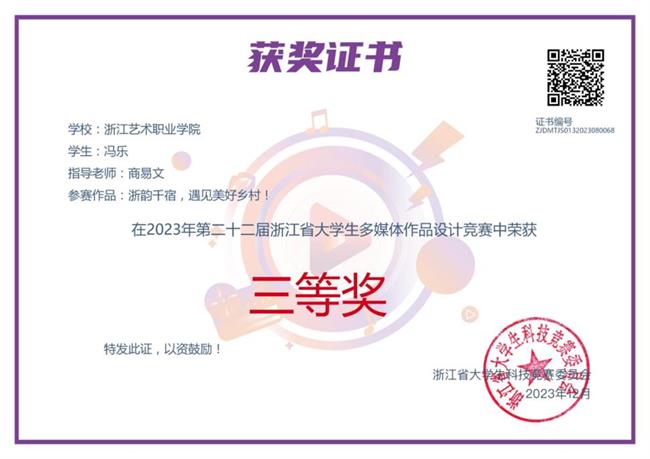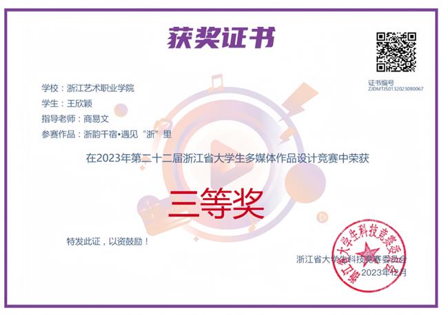 近日,第二十二届浙江省大学生多媒体作品设计竞赛决赛在浙江师范大学举行。由我院广告艺术设计专业商易文老师指导,21级广告艺术设计专业的学生王欣颖创作的《浙韵千宿·遇见“浙”里》和冯乐创作的《浙韵千宿,遇见美好乡村》在比赛中荣获三等奖。