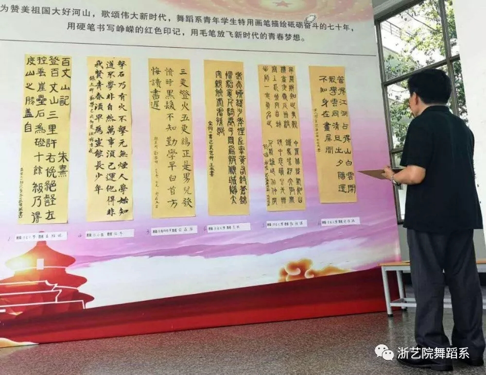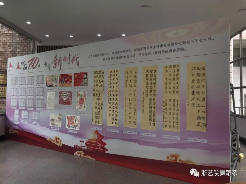 今年正值五四运动100周年,新中国成立70周年,为赞美祖国大好河山,歌颂伟大新时代,舞蹈系青年学生用画笔描绘砥砺奋斗的七十年;用硬笔书法记录峥嵘的红色印记;用毛笔放飞新时代的青春梦想。