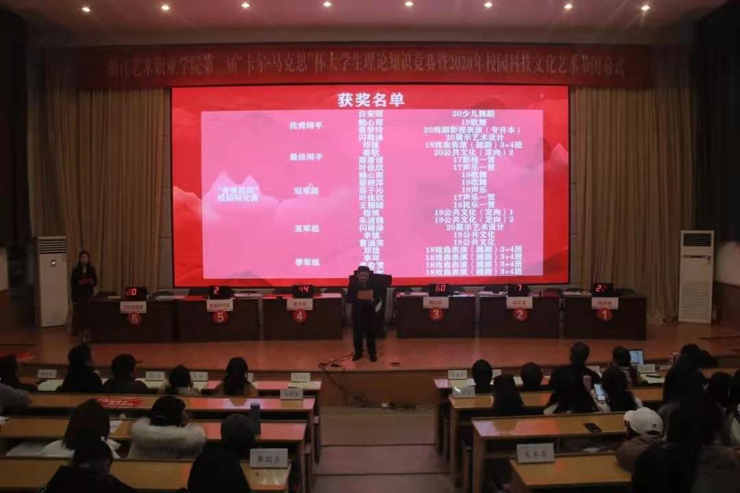 11月28日晚,浙江艺术职业学院2020年度“卡尔·马克思”杯理论知识竞赛决赛在图信中心举行。校党委委员、宣传部部长马向东,相关职能部门负责人、各系部党总支负责人、竞赛选手、学生代表200多人到场,报告厅座无虚席。