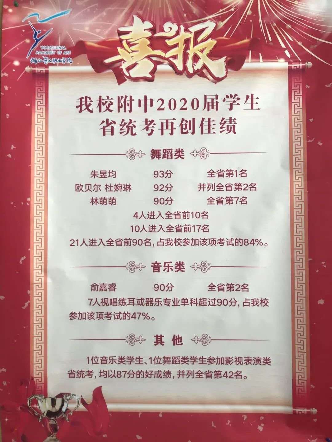 我在这次的浙江省舞蹈专业统考中获得了全省第一名的好成绩,首先要对所有帮助过我的老师们说一声:谢谢老师,老师们辛苦了!感谢张星老师对我的用心良苦,对我的不放弃。我曾经是个常常偷懒的小懒猫,张星老师对我非常严格,在课上我每一次偷懒的瞬间都逃不过她的眼睛,每一个动作她都要求必须延伸到位,正是年复一年日复一日的严格要求,才有了我的一些小小的进步。现在校考已经开始,高考就在眼前,我会牢记自己要去的地方,继续努力前行,加油吧!