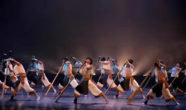 脚划船亦称“乌篷船”,俗称“小船”,流行于浙江水乡的一种传统交通工具,《脚划船》以民族民间舞演绎脚划船,加入诙谐幽默的风格元素,描绘出水乡人民对美好幸福生活的向往,和对全面建成小康社会的期盼。