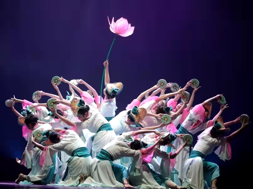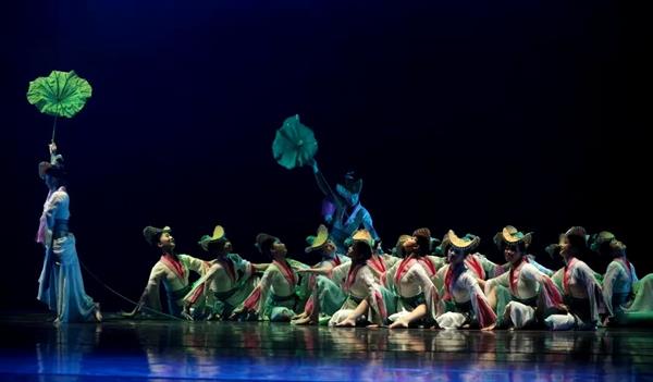 “越江女,越江莲,齐菡萏,双婵娟。嬉游向何处,采摘且同船。”《莲鼓越歌行》取材于传统的江南水乡花鼓文化,将其融入古典舞,“敲击”出了江南水乡的采莲美景。