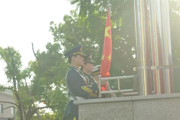 7:00整,伴随着慷慨激昂的出旗音乐,国旗队的护旗手们踏着整齐划一的步伐走上旗台,“升国旗,奏唱国歌,行注目礼,敬礼!”,鲜艳的五星红旗冉冉升起。