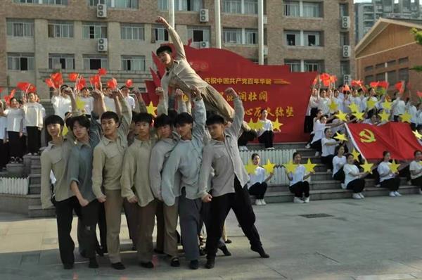 旗台前的阶梯上,19级、20级编导班(少儿舞蹈方向)的45名同学,组成了五星方阵,她们用自己手中的五角星,整齐有序地拼写出“一大、二大、三大……十九大”,配以旁白,以新颖的方式介绍了中国共产党历次代表大会取得的重要成果。同时,19级舞蹈编导和20级舞蹈表演的16名男生以舞蹈表演的形式,演绎了《没有共产党就没有新中国》,充满力量的舞蹈动作象征着先辈们坚定不移的革命信念。