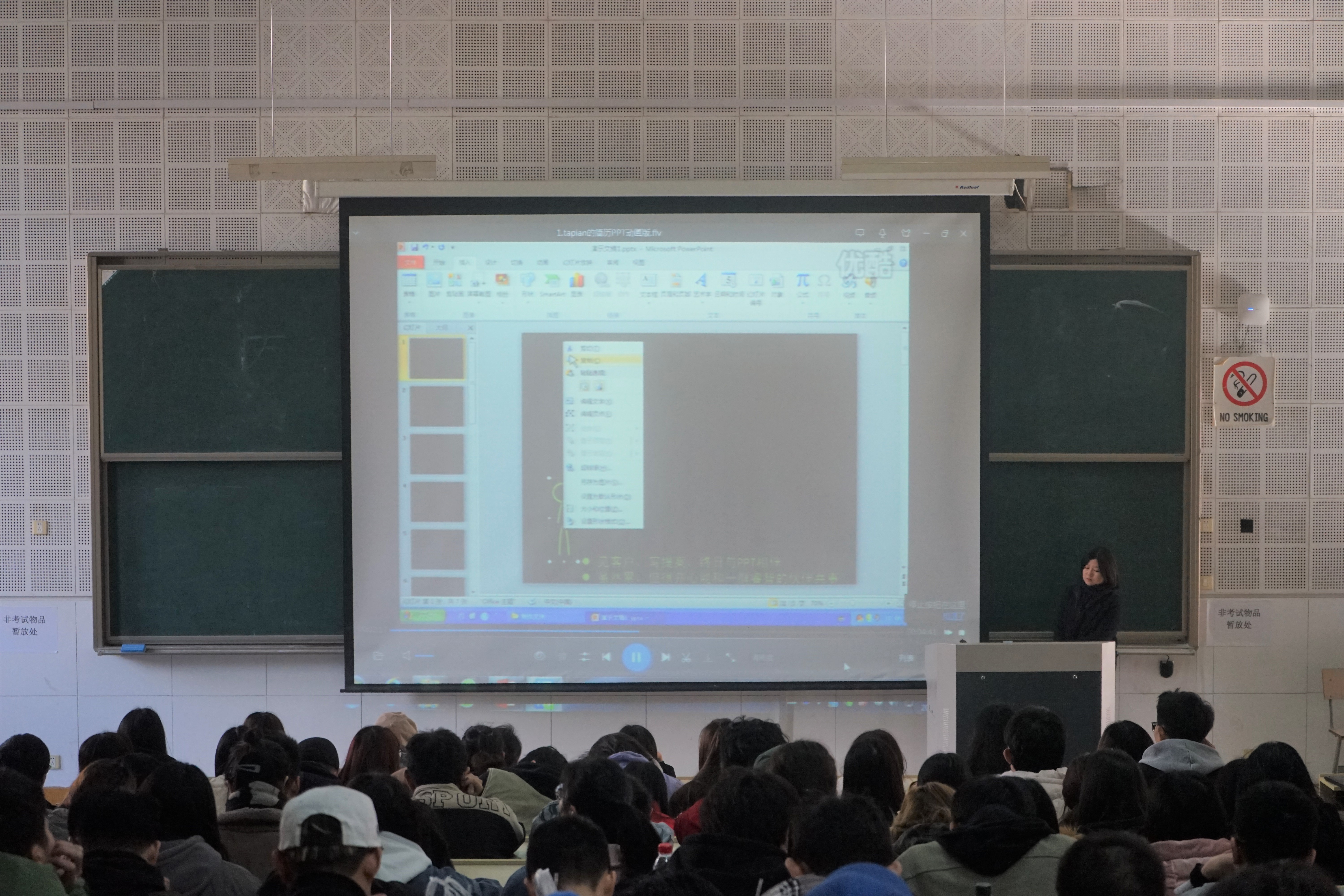 随后潘帆又以写作技巧为重点展开演讲。简历是敲门砖,是吸引HR的关键,学生们要用“写作”技巧获取工作机会。简历分为传统简历和创意简历。潘帆指出创意简历是关键所在,学生需要的是以视频、音频、HS、网页等形式呈现简历。她又以HR眼中的简历、普通的传统简历为例子,告诉同学们在简历制作中创意的重要性,并对同学们的艺术细胞给予高度肯定和期待。