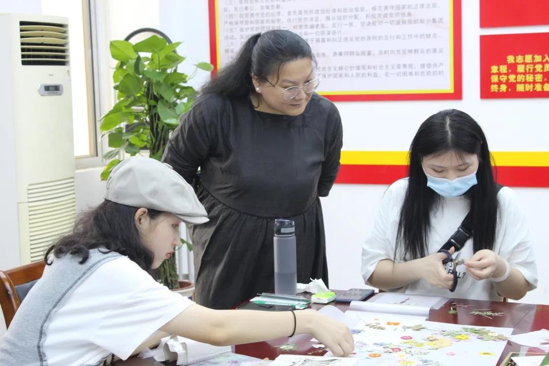 文化管理系展示艺术设计教研室黄茜老师对在场体验的师生进行一对一指导和示范,鼓励同学们发挥自己的想象力,大胆创新,用自己的奇思妙想将一个个植物标本拼贴成一幅独具特色的画。