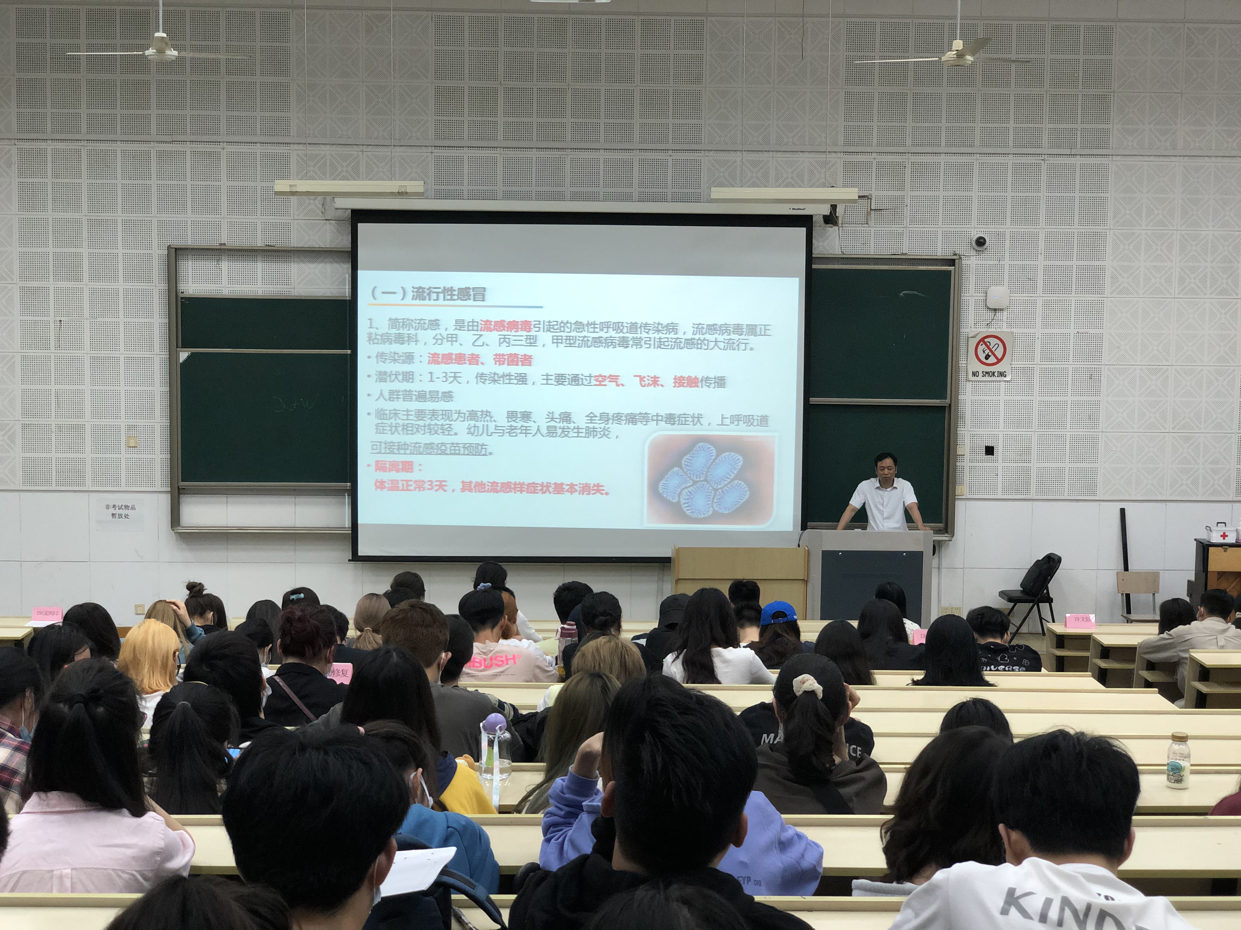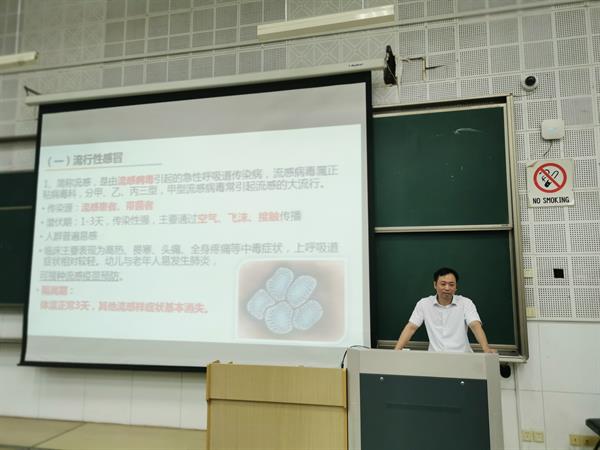 廖主任有二十余年的临床内科疾病诊治经验,积累了丰富的流行性疾病防控诊治经验。他通过丰富的视频和图片资料,阐述了秋冬季高发的流行性感冒、水痘、诺如病毒感染、急性出血性结膜炎、肺结核、手足口病、新冠肺炎的发病原理、传播途径和预防措施。告诫同学们勤洗手,勤通风,注意个人卫生习惯,身体不舒服及时与老师联系争取做到早发现,早报告,早处理。