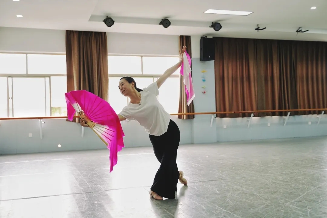 汪云老师的独舞《沂蒙山小调》是中国民族民间舞胶州秧歌的代表作品,胶州秧歌动律特点,可概括为“抻、韧、碾、拧、扭”五大特点。因为换脚拧步过程快,姿态形成过程慢,因此在上推扇时,把韧劲推向身体各部位,从脚到膝、腰、肩、头、双肩、指间,直到神经末梢,展现出来的效果是肢体渐渐伸展,给人一种神韵丰厚饱满之感。汪云老师的授课对象是乡镇文化员定向培养班,学生通过对民间舞的学习,可了解更多的地方特色舞蹈。同时,选择《沂蒙山小调》作为此次考核的曲目,也是教师为建党一百周年的一次献礼。