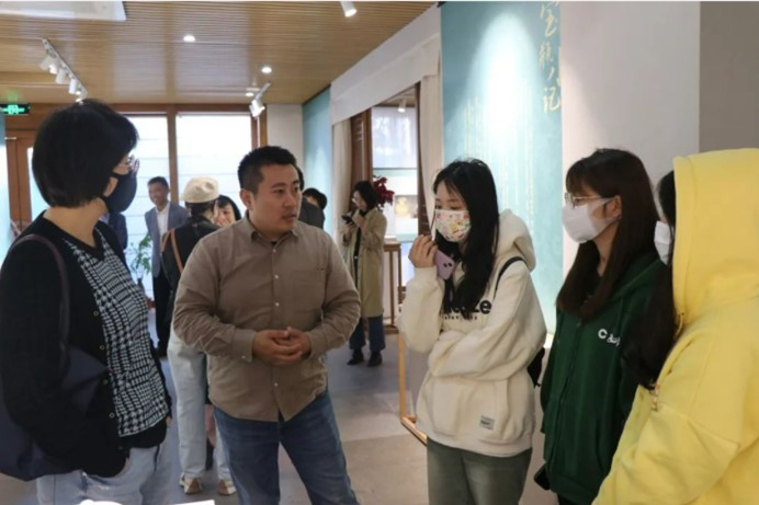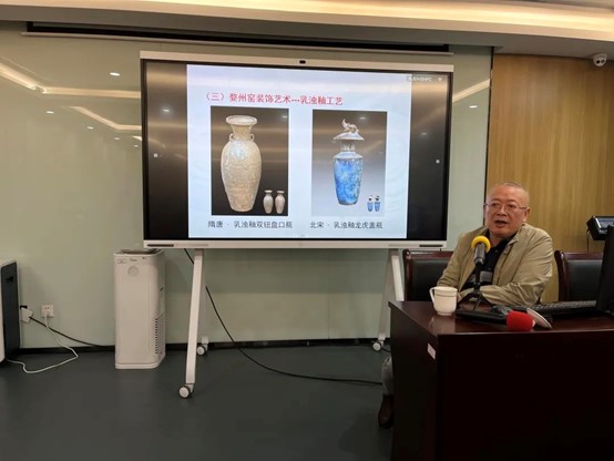 师生们观展结束后,邵文礼开展关于“婺州窑工艺特征”的专题讲座。他讲述了婺州窑历史、工艺及当代婺州窑传承,婺州窑点褐彩、化妆土、乳浊釉、堆塑等多项工艺,并同师生就陶瓷工艺的传承、发展及就业创业方向展开探讨。