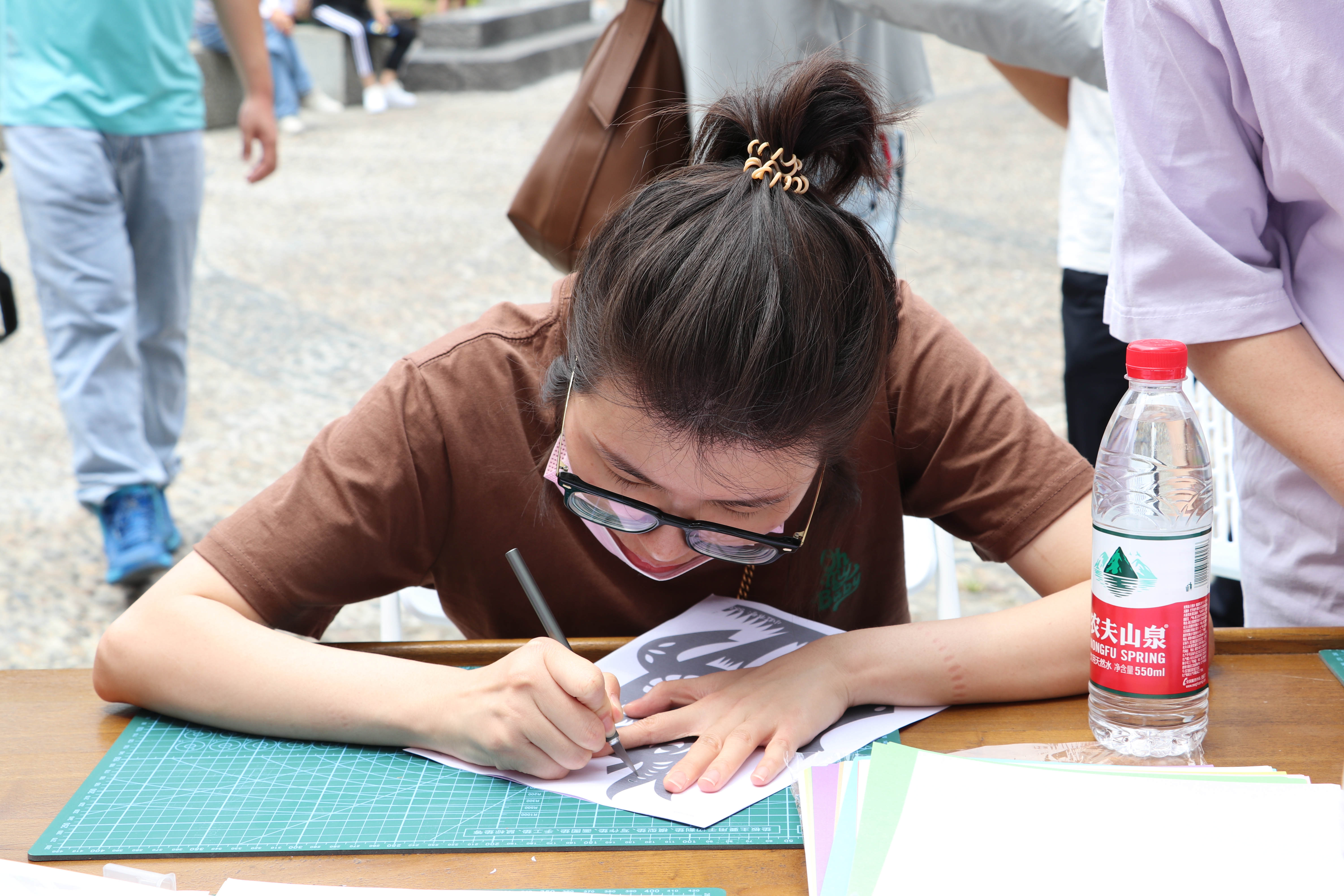 在剪纸的摊位上,艺小匠同学为体验者讲解刻刀的正确使用方法并细心指导剪纸,村民们聚精会神,每一刀的力度都尽力把握,开始虽有些许吃力,但经过适应逐步体验到了剪纸的精髓与乐趣所在。
