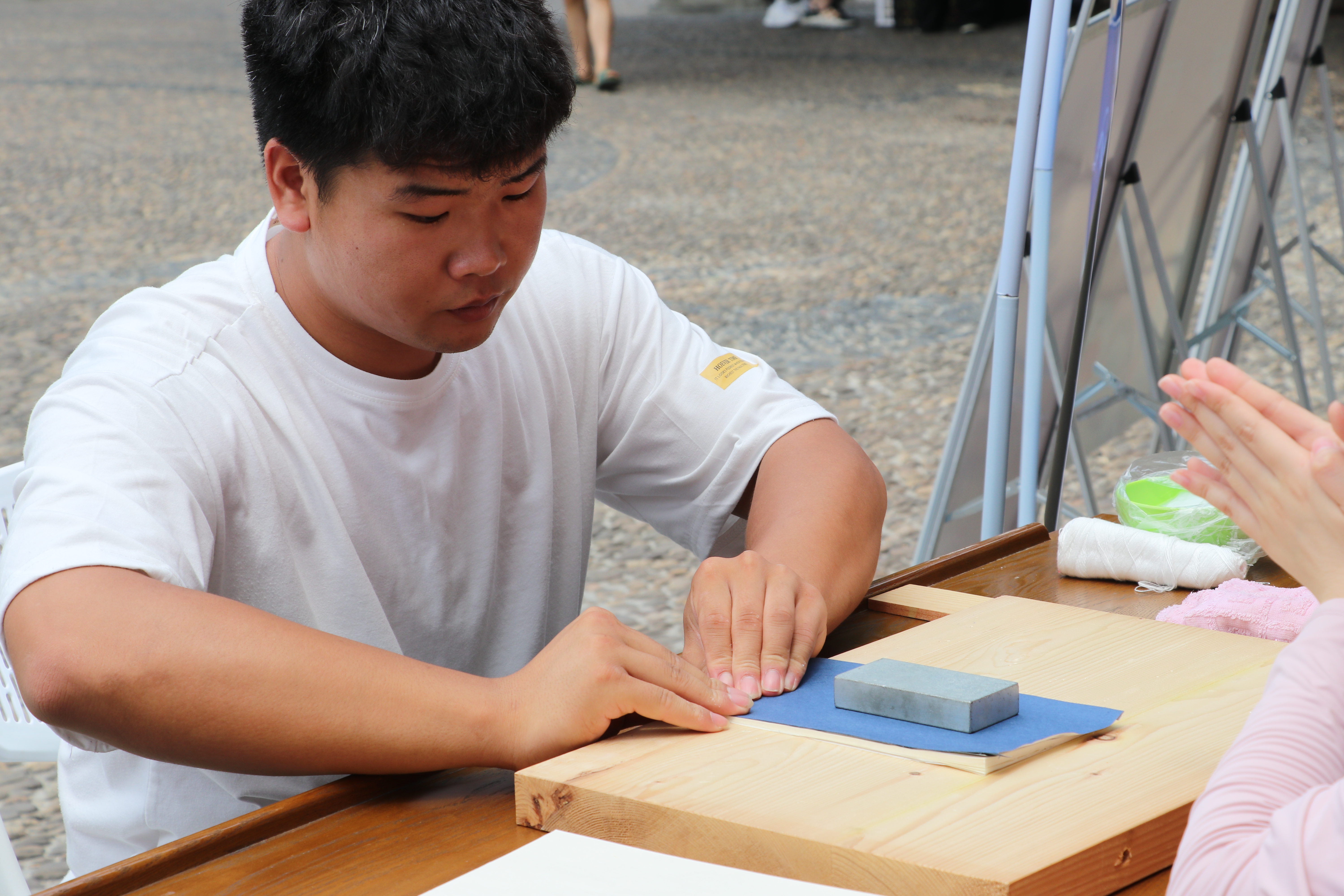 在水印木刻的摊位上,艺小匠同学详细示范了木版水印画的印制步骤,在他们的指导下,体验者们有模有样地将蘸取墨水的刷子在木版上刷色,仔细地均匀涂抹版面,观察好版面的位置后,把宣纸对准印版平铺,借助马莲在平铺的纸上来回旋转摩擦,使纸面和版面上的墨充分接触。