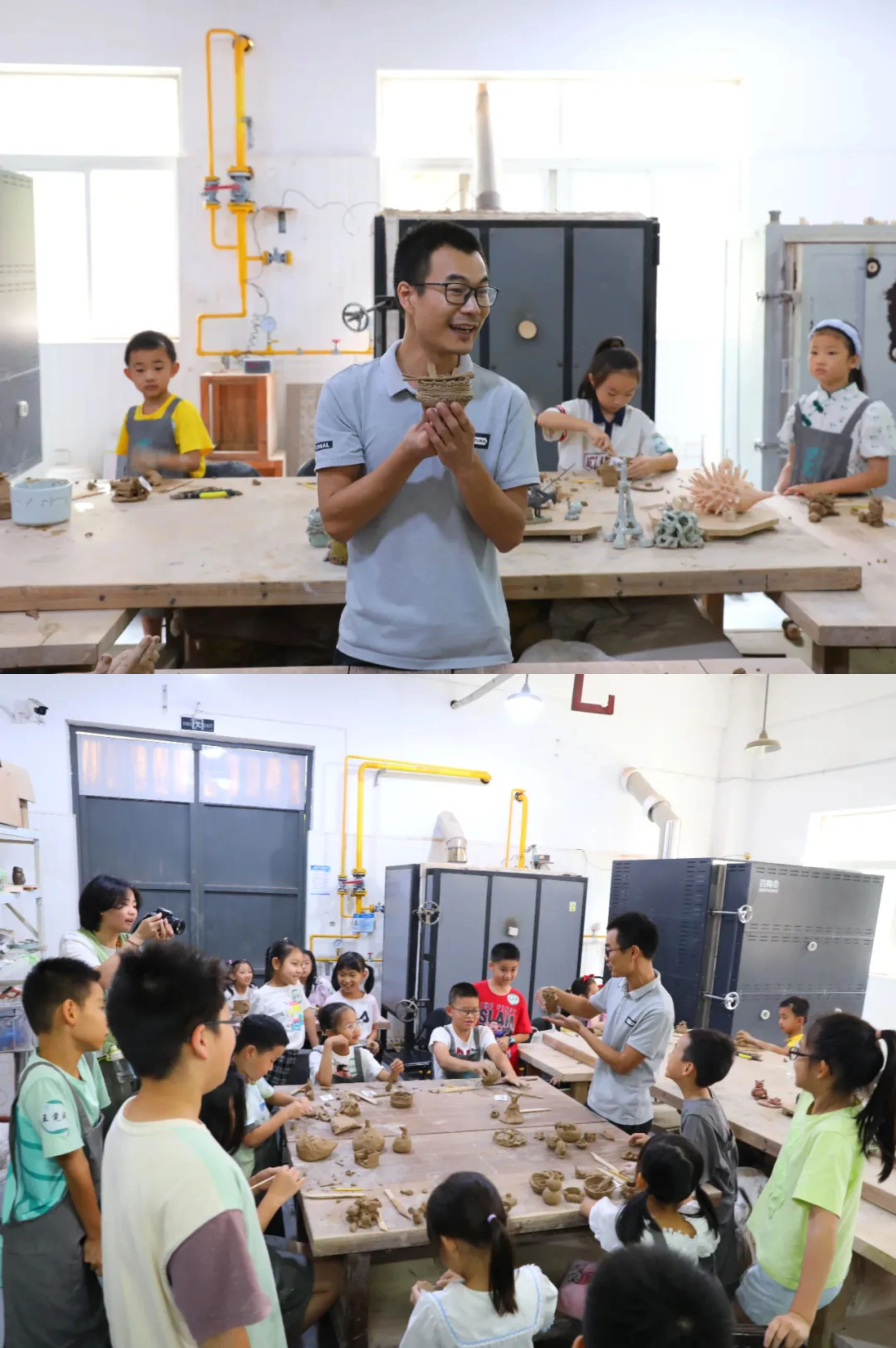 上午,小朋友们齐聚手工艺学院陶艺实训室,在专业授课教师傅菲菲老师和郑源雷老师的带领下领略了传统陶艺的魅力。小小陶泥在小手中变化各异,呈现出了无穷的创造力,每张小脸上都笑容洋溢。