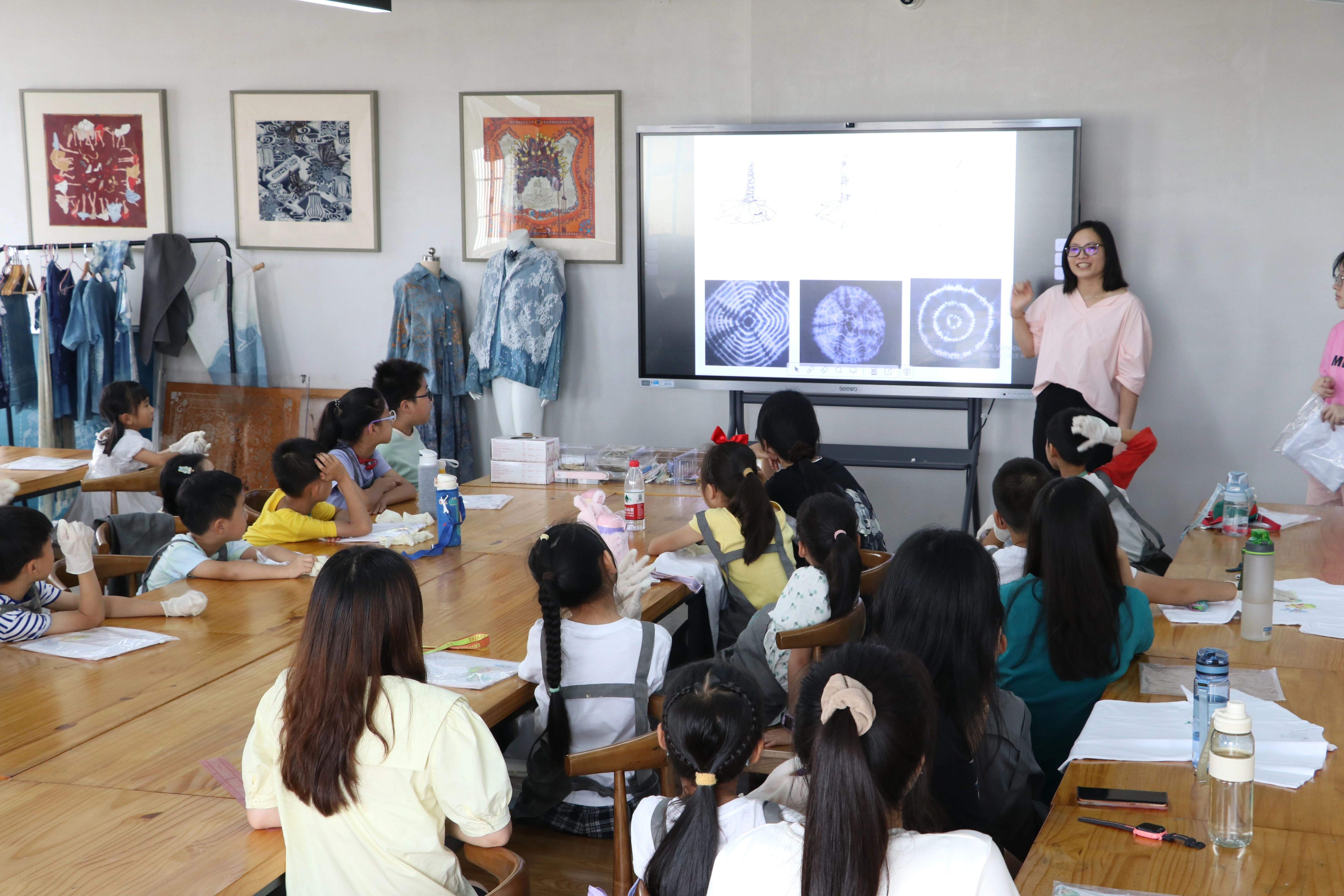 课上,胡锦霞老师还为孩子们介绍了各种印染技巧、植物染料和传统扎染中的独特工艺,为孩子们上了一场生动的文化体验课。让孩子们在动手中学习“敬业、精益、专注、创新”的工匠精神,胡老师言传身教,在传授印染手艺的同时,也传递耐心、坚持、执著追求的精神特质。