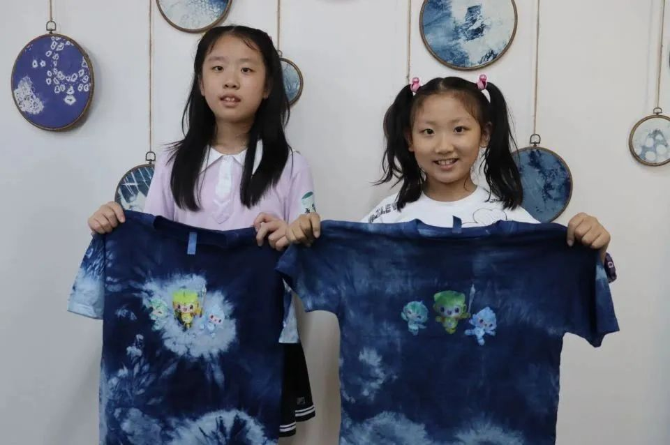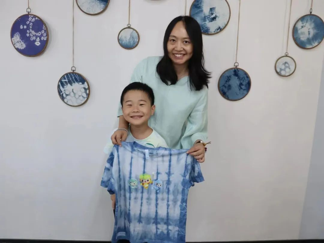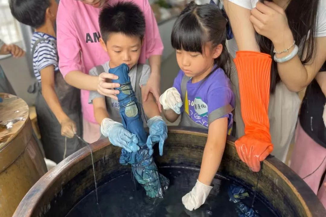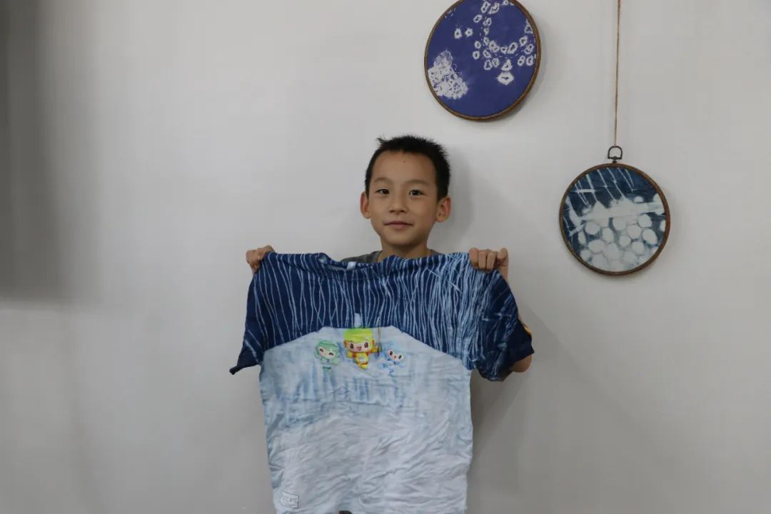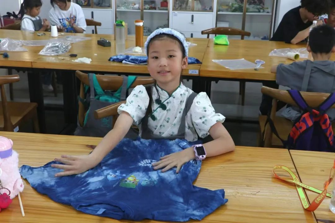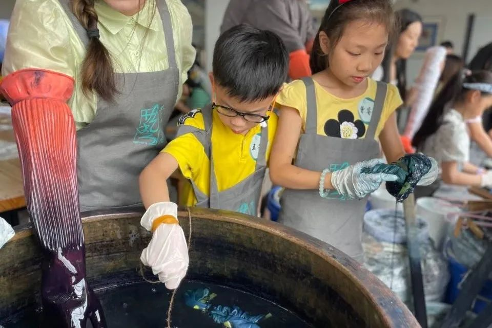下午,在手工艺学院扎染实训室,小朋友们跟着专业授课教师胡锦霞老师体验了一把扎染的乐趣。在“艺小匠”志愿者团队的帮助下,孩子们在这场与“染”的邂逅中,体验用木棒、树叶、麻绳等简单材料,经过巧手加工,放入靛蓝染缸里,创造出了独一无二的专属扎染作品。