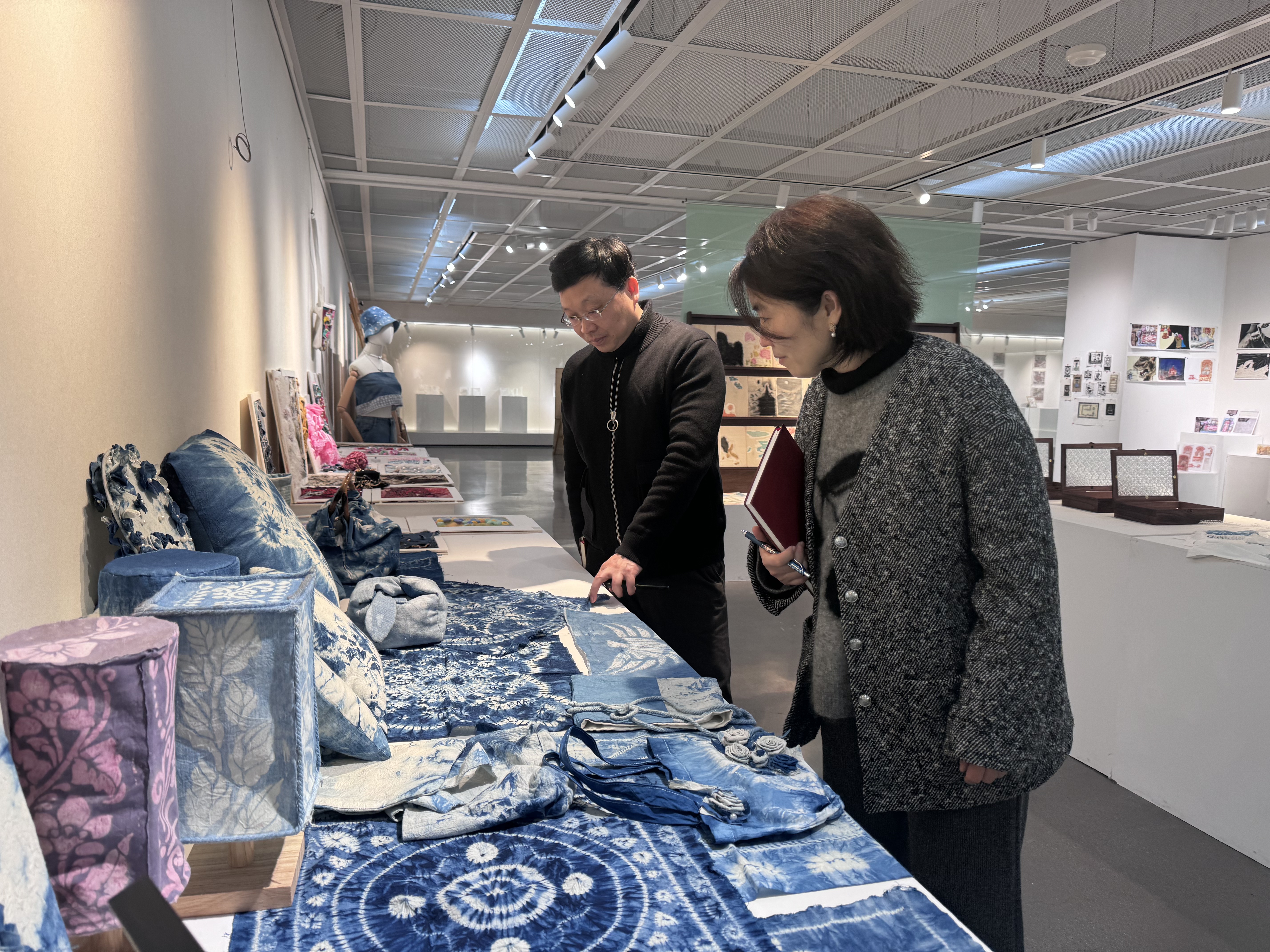 随后,前往手工艺学院实训楼三楼展厅,参观“古艺新续”作品展。展览汇集了学院师生的创意成果,通过传统工艺与现代设计的融合,展现传统文化在当代的创新表达。张晨昕高度评价了策展理念,他表示:“非遗与文物的传承不仅是技艺的延续,更是生活美学的传播。希望未来通过校馆合作,以项目制课程的形式,让更多青少年接触、理解并热爱这些优秀的传统文化。”