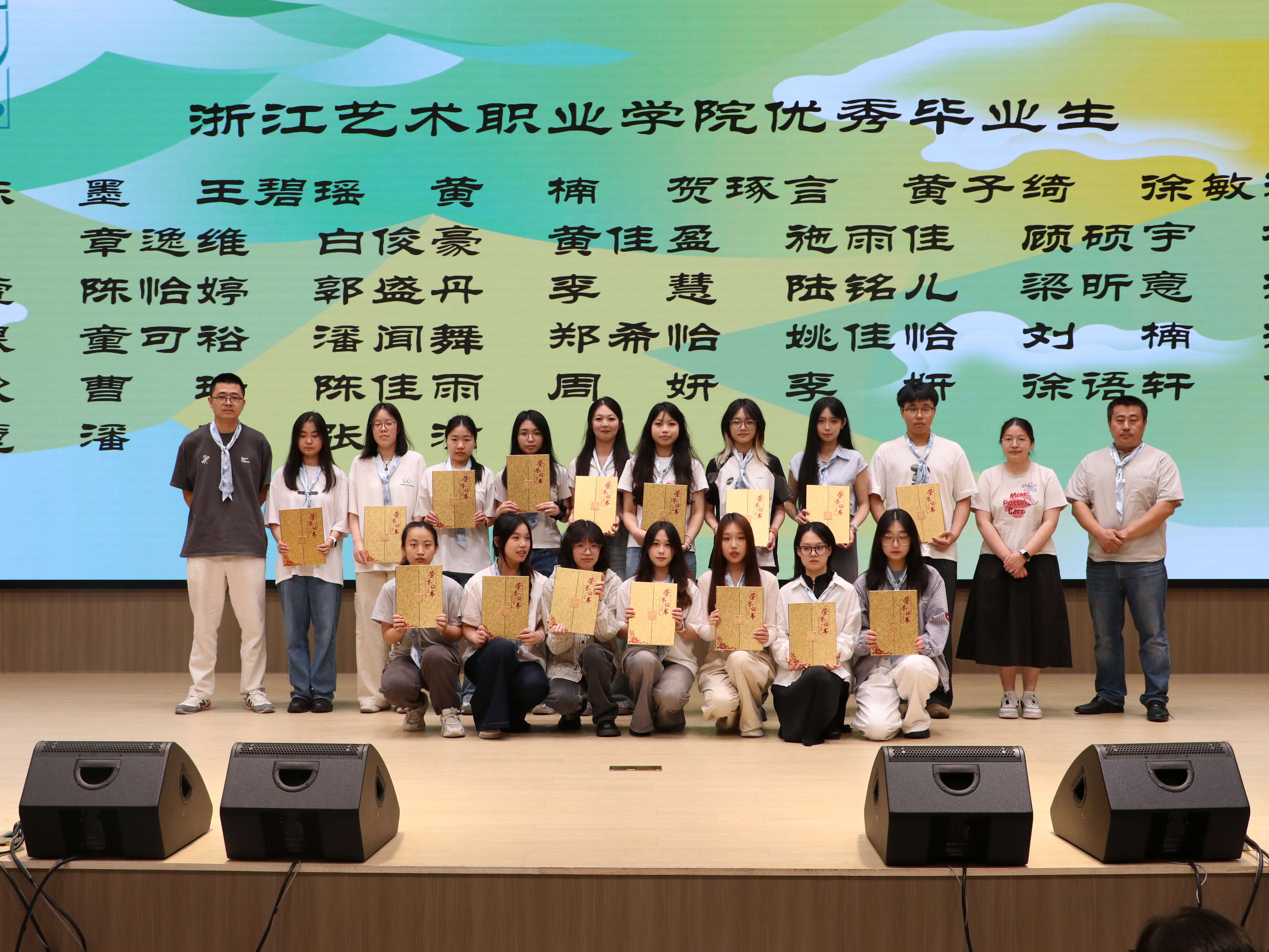 学校特别定制的毕业纪念礼物也在现场发放,全体毕业生将定制的印染丝巾挂在胸前。它经历染色、浸泡、晾晒等多个环节,仿佛映照着同学们在校三年的成长和收获。它既是离别的纪念,也是前行的祝愿:愿你们在未来的世界中,也能将人生染出属于自己的色彩。