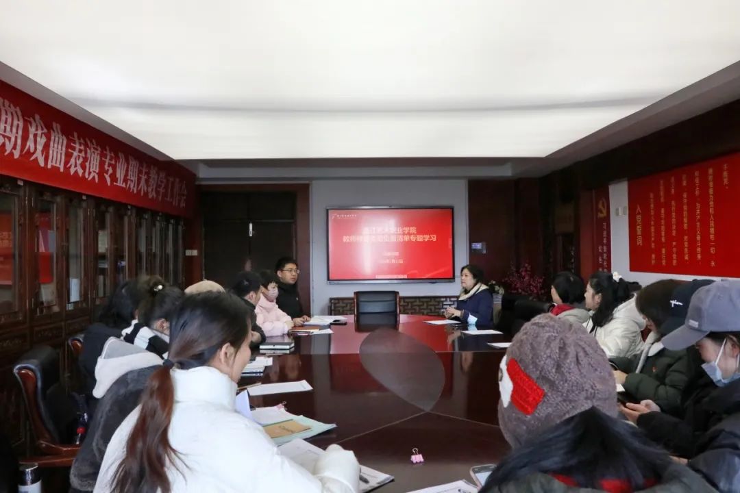 戏曲学院党总支书记谢志勇结合学校开展的师德师风专项检查工作,带领全体教职工认真学习了《浙江艺术职业学院师德失范负面清单》《浙江艺术职业学院教职工校外兼职管