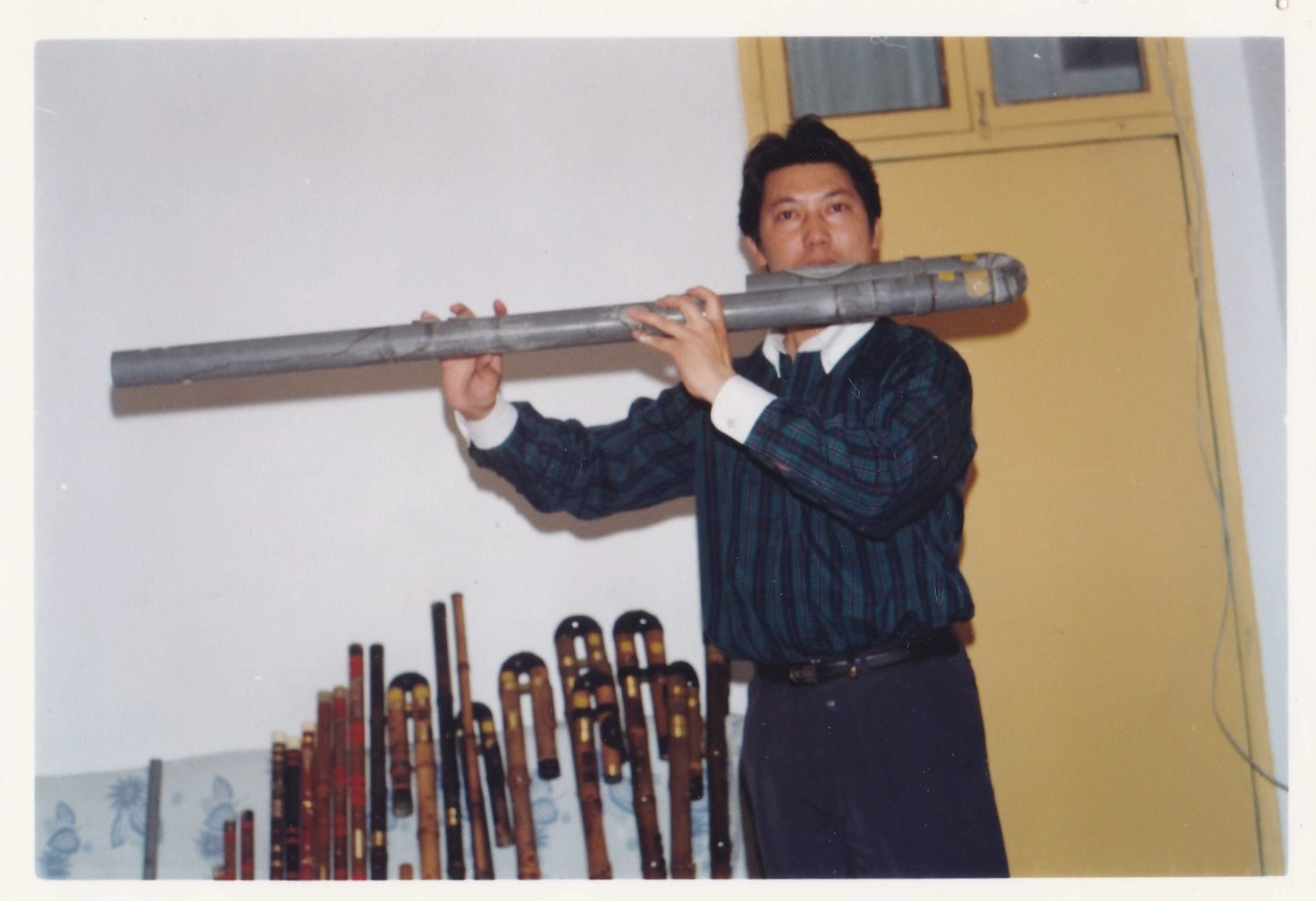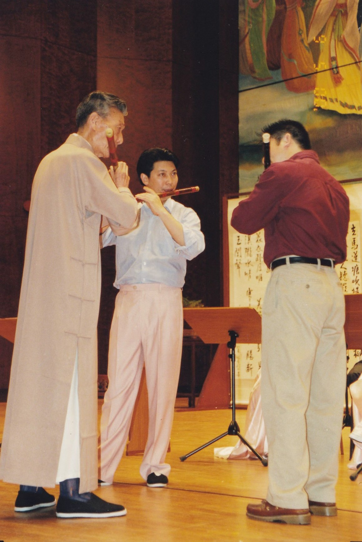 杜如松在试吹赵松庭先生研发的弯管笛