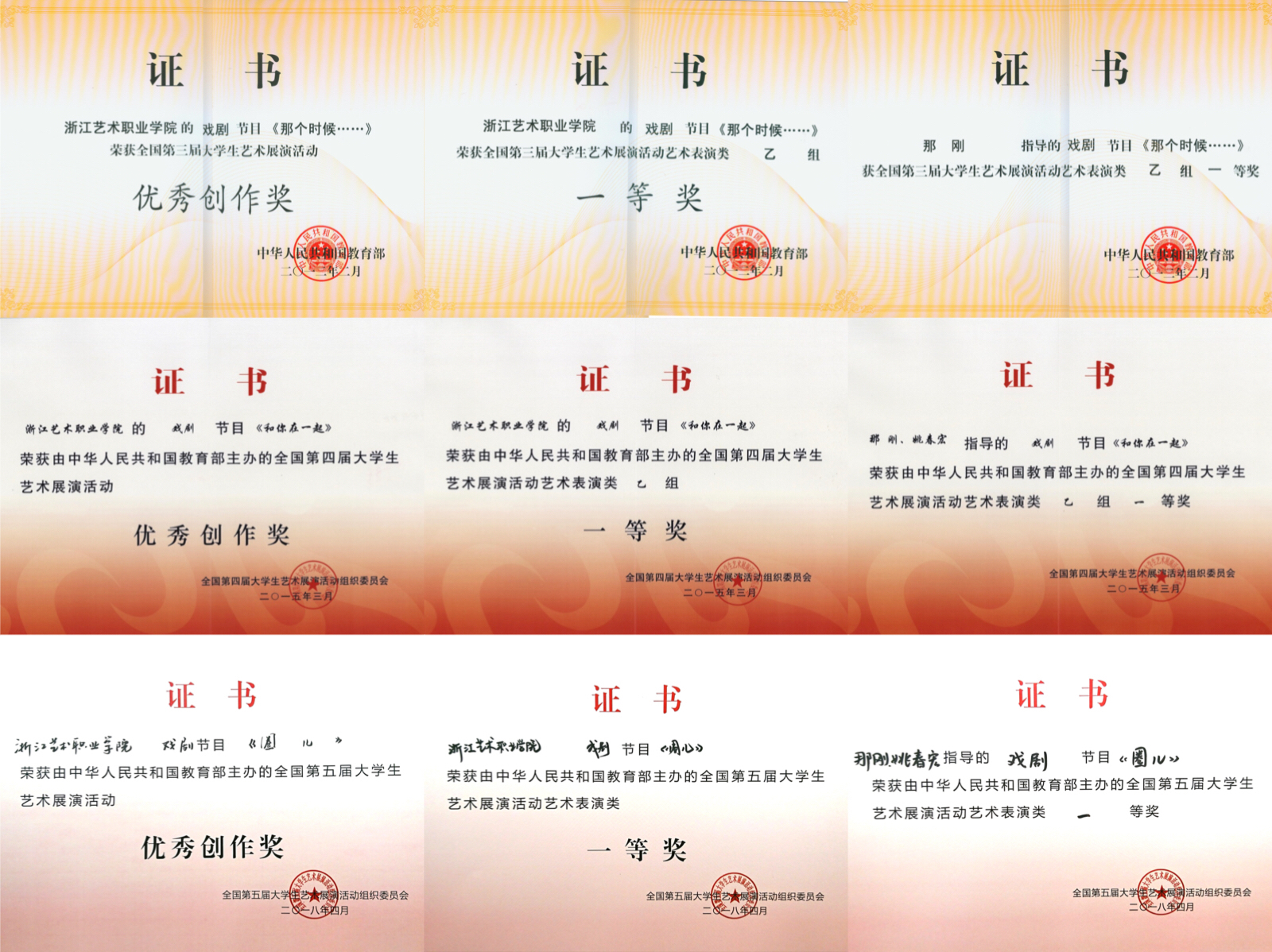 深耕教科研创融合发展,推动成果从“数量积累”向“质量跃升”转变,产出了一批具有影响力的高水平成果。在教学改革方面,获全国职业教育优质教材、国家教材奖二等奖,省级教师教学能力比赛一等奖1项、三等奖3项。开展“1+X”证书试点工作,组织实施浙江省礼仪主持人、音响调音员等职业技能鉴定,累计为行业培养持证人才800余人次,推动“岗课赛证”融通。在科研创作方面,完成国家艺术基金资助项目1项,立项国家社科基金艺术学项目1项,摄制省教育厅系列微电影《我爱我的老师》,自产上线微短剧《墨痕未干时》,浙江省舞台艺术重大主题创作揭榜挂帅项目原创话剧《梦想天堂》入选第十六届浙江省戏剧大赛终评剧目,清廉题材微电影《净・铅华》获国家级金奖。