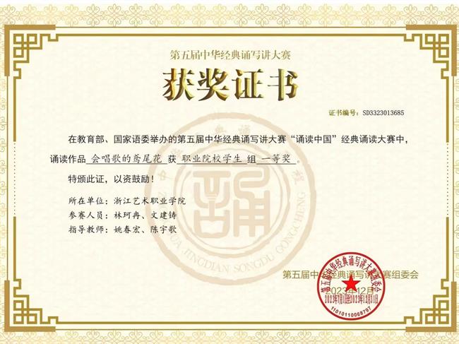 着力培育艺术创新与技术实践兼备、德艺双馨的高素质复合型人才。近年来,学院师生在全国大学生广告创意设计竞赛、全国中华经典诵写讲大赛等国家级、省级各类专业竞赛中累计获奖500余项,连续三届获全国大学生艺术节获一等奖,在浙江省大学生国际创新大赛、“挑战杯”、职业生涯规划大赛中获金奖3项、银奖3项、铜奖10项。构建“课程+”“文化+”“管理+”“服务+”“实践+”五育协同育人体系,累计开展各类校园文化活动500余场,参与师生达2万人次。组建“红色轻骑兵”宣讲团,在校园内外开展巡回宣讲百余场,推动党的创新理论入脑入心。