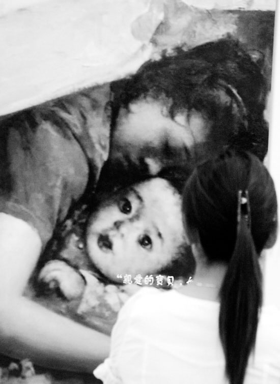 展览现场,裂开的土地、沉默的废墟、受伤的孩子……图文构成的海报震撼着每个观者的心。一条杂乱的心电图穿过排列地整整齐齐的课桌,一个小女孩张着惊恐的眼睛在说,“妈妈,别离开我,请带我一起心跳。”一颗颗红心填在裂开的鸿沟上,蜿蜒伸向远方,“用我们的爱心,缝合灾难留下的裂缝……”一张张凌乱的寻人启示写着一句句急迫的话,“寻找家人”“寻找父母”“无论你在哪里,我们都要找到你!”……