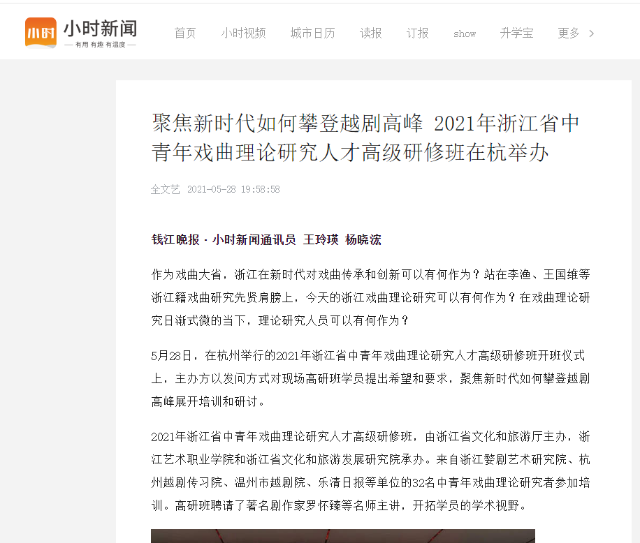 2021年浙江省中青年戏曲理论研究人才高级研修班,由浙江省文化和旅游厅主办,浙江艺术职业学院和浙江省文化和旅游发展研究院承办。来自浙江婺剧艺术研究院、杭州越剧传习院、温州市越剧院、乐清日报等单位的32名中青年戏曲理论研究者参加培训。高研班聘请了著名剧作家罗怀臻等名师主讲,开拓学员的学术视野。