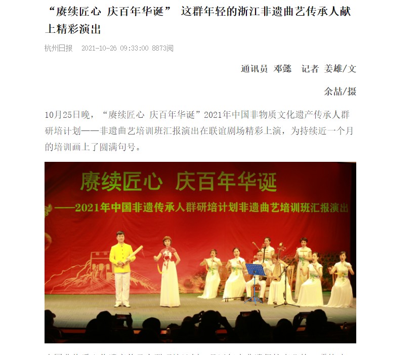 “很感谢有这样的培训机会。”参加演出的学员、绍兴平湖调演员朱泽钰说:“在培训中,各个曲种擦出了不同的火花,让我对表演有了许多新的感悟。”