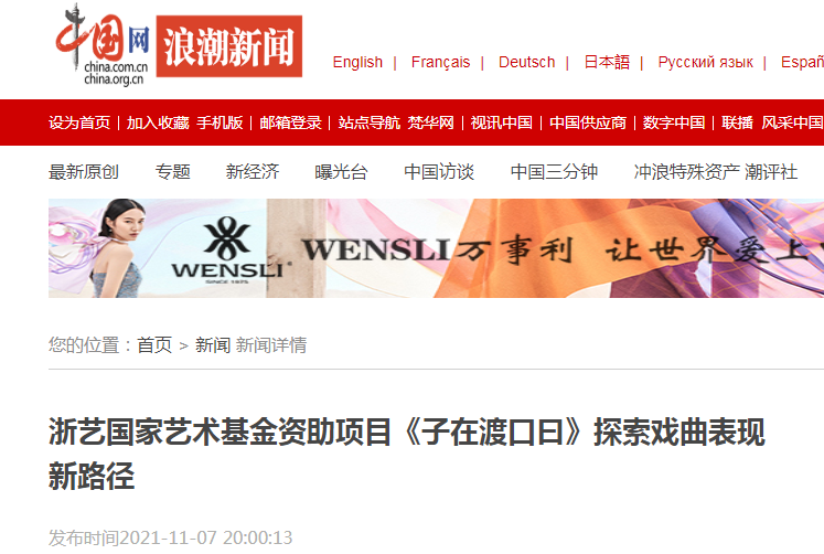 11月5日、6日,浙江艺术职业学院2020年度国家艺术基金资助项目越剧折子戏《子在渡口曰》走进临平剧院。该剧由戏曲学院2018级南京班学生演出,以唯美精致的传统水墨风格的舞美设计,充满冲突的戏剧故事情节和深刻的思想内涵征服了观众,现场不时响起热烈的掌声,久久不息。