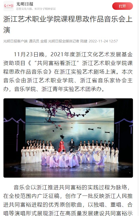 11月23日晚,2021年度浙江文化艺术发展基金资助项目《“共同富裕看浙江”浙江艺术职业学院课程思政作品音乐会》在浙江实验艺术剧场上演。本次音乐会由浙江艺术职业学院、浙江省音乐家协会主办,音乐学院、浙江青年实验艺术团承办。