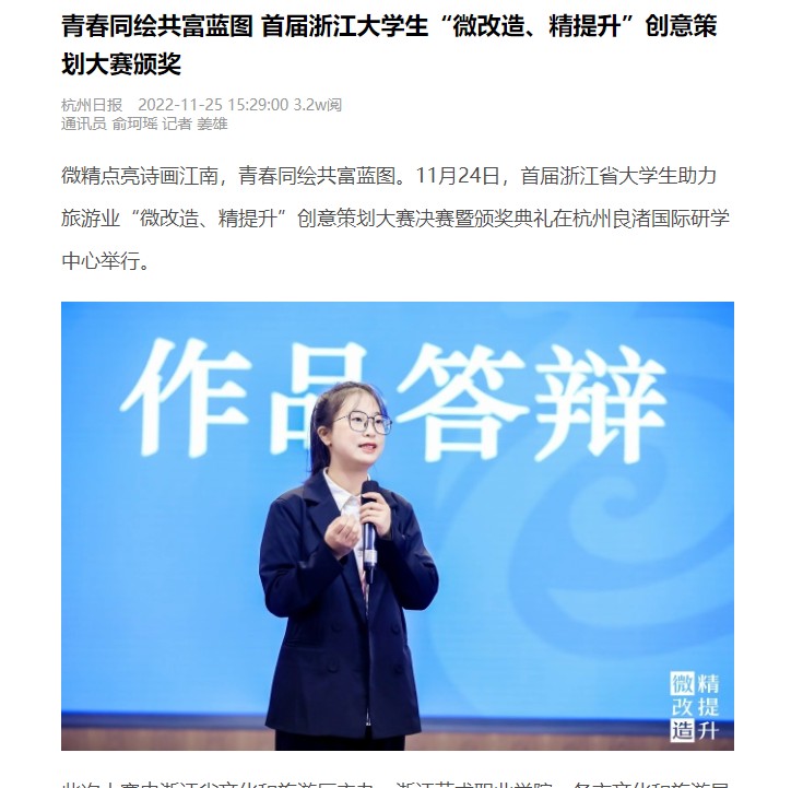 微精点亮诗画江南,青春同绘共富蓝图。11月24日,首届浙江省大学生助力旅游业“微改造、精提升”创意策划大赛决赛暨颁奖典礼在杭州良渚国际研学中心举行。