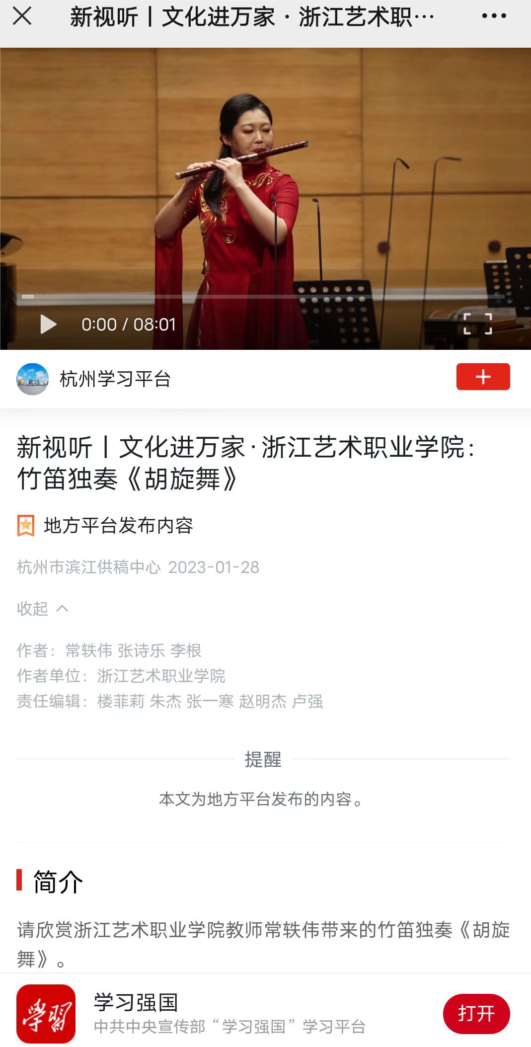 学习强国杭州平台:新视听丨文化进万家·浙江艺术职业学院:竹笛独奏《胡旋舞》