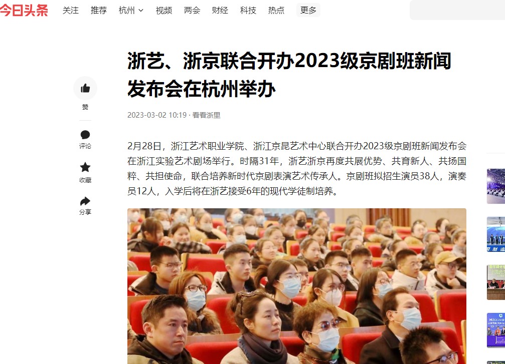 2月28日,浙江艺术职业学院、浙江京昆艺术中心联合开办2023级京剧班新闻发布会在浙江实验艺术剧场举行。时隔31年,浙艺浙京再度共展优势、共育新人、共扬国粹、共担使命,联合培养新时代京剧表演艺术传承人。京剧班拟招生演员38人,演奏员12人,入学后将在浙艺接受6年的现代学徒制培养。