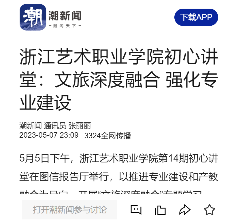 5月5日下午,浙江艺术职业学院第14期初心讲堂在图信报告厅举行,以推进专业建设和产教融合为导向,开展“文旅深度融合”专题学习。