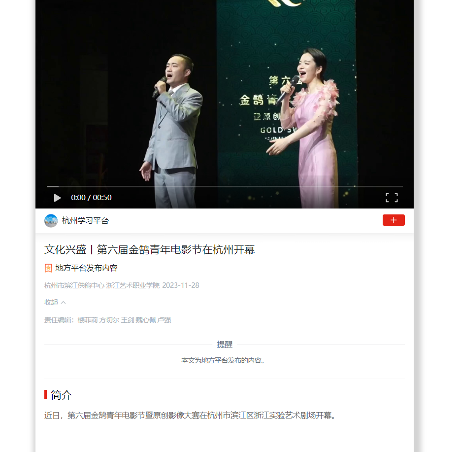 学习强国杭州平台:文化兴盛丨第六届金鹄青年电影节在杭州开幕
