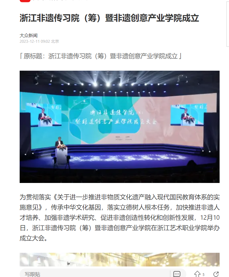 浙江非遗传习院(筹)暨非遗创意产业学院的成立,标志着浙江艺术职业学院在非遗传承保护领域又迈进了一大步,是产教融合共同体建设的一个生动样本。
