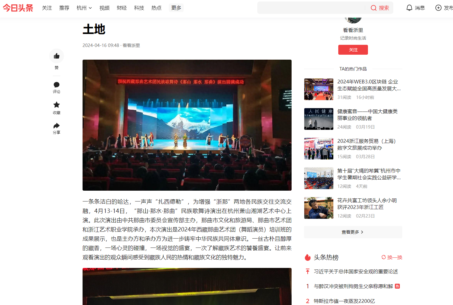 一条条洁白的哈达,一声声“扎西德勒”,为增强“浙那”两地各民族交往交流交融,4月13-14日,“那山·那水·那曲”民族歌舞诗演出在杭州萧山湘湖艺术中心上演。此次演出由中共那曲市委员会宣传部主办,那曲市文化和旅游局、那曲市艺术团和浙江艺术职业学院承办,本次演出是2024年西藏那曲艺术团(舞蹈演员)培训班的成果展示,也是主办方和承办方为进一步铸牢中华民族共同体意识。一丝古朴且醇厚的藏香,一场心灵的碰撞,一场视觉的盛宴,一次了解藏族艺术的饕餮盛宴。让前来观看演出的观众瞬间感受到藏族人民的热情和藏族文化的独特魅力。