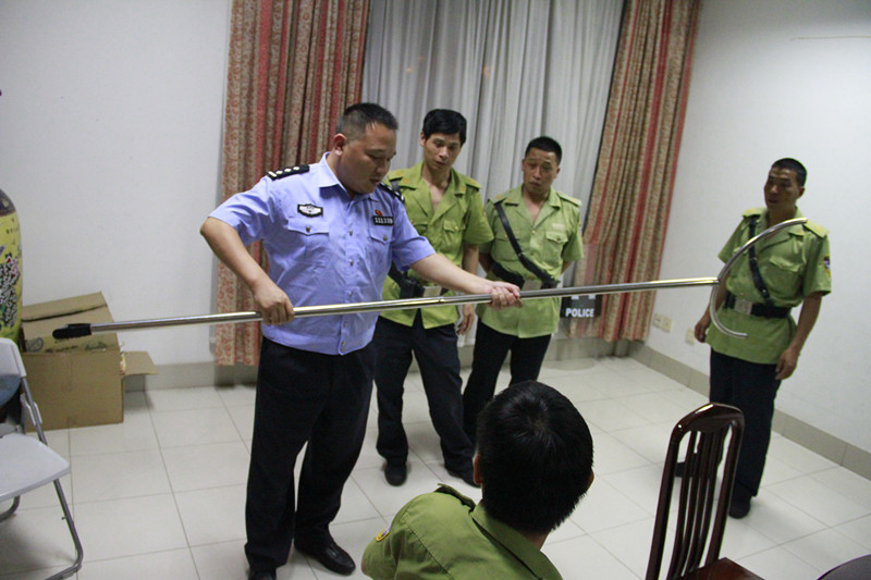 演习结束后,全体参演人员在行政楼一楼会议室进一步布置了反恐工作要点。会议中,单志勇明确了校园反恐要求,提出用“小组均匀分配”等战术合理制服“歹徒”,强调要在学生较为集中的地点和时间段加强防范。单志勇还为校卫队员现场演示并指导讲解了钢叉、盾牌、警棍等武器的使用,取得了很好的效果。