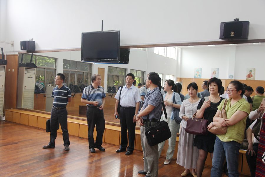 鲍贤俊一行观看了学院宣传片,参观了戏剧系、音乐系、舞蹈系、文化管理系的教学与实训场所,随堂观看了毯功、身段与台步、管弦乐合奏、芭蕾舞等课程教学,并参观了音乐厅、琴房、艺术展厅等教学实践场所。