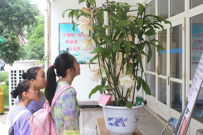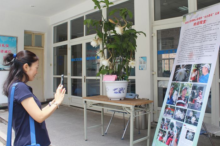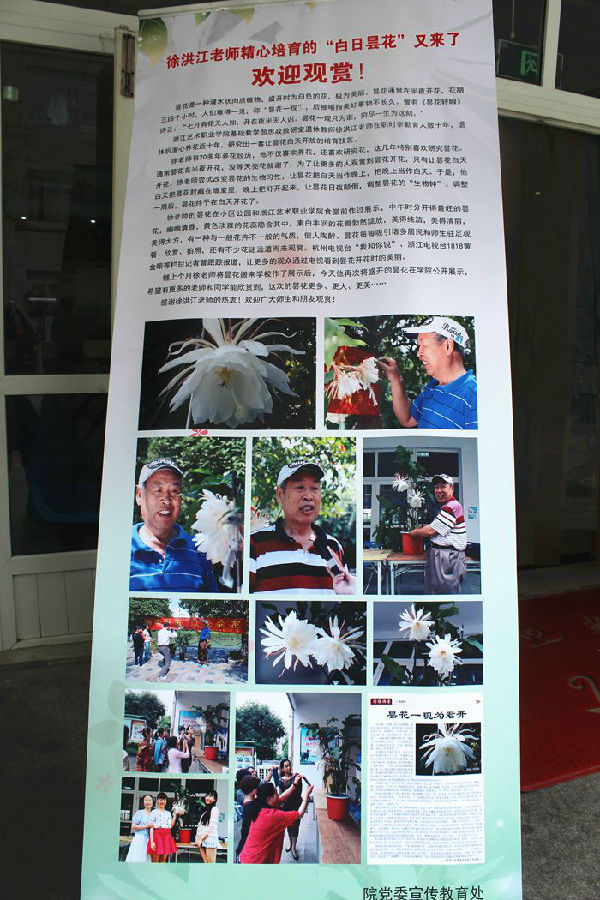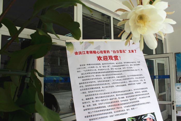 我采访了徐洪江老师,了解到这盆昙花与他背后的故事。为了这次花展,徐老师在前一天忙活到半夜12点多,凌晨3点多起床准备花展。由于昙花盆景植株较高,无法用私家车运送至学校,后来联系上学校的班车进行运送。在准备这次花展的过程中,徐老师也面临着家里的一些困难。徐老师的妻子身体不好,需要徐老师照顾。而徐老师在学院办花展让大家分享快乐的心一直存在,有时面临两难选择。当记者询问徐老师为什么想要办这么一次花展的时候,徐老师给了我实在而有内涵的16个字——“资源共享,信息交流,互通有无,共同快乐”。他说这就是他办花展的初衷。采访过程中,徐老师始终态度和蔼、精神乐观。前一天夜间他同时在做着照顾妻子和培育昙花之事,忙前忙后。徐老师说,他做的都是一些他认为值得做的事,即使累,即使繁琐,他也愿意做,这是累并快乐着。