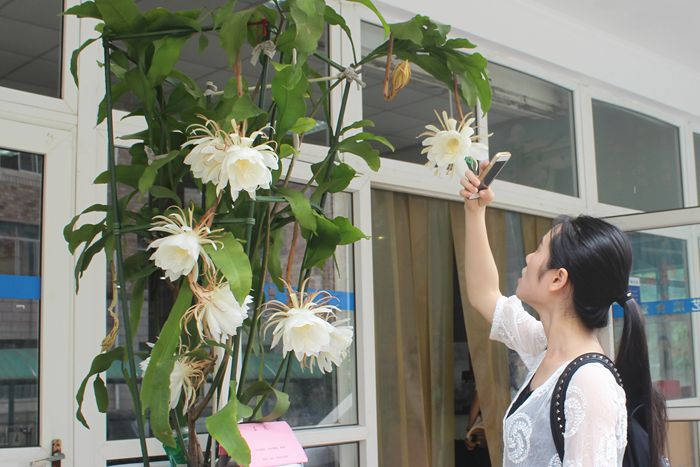 候孝贤的电影《军中乐园》中有这么一个片段,女主妮妮冒着生命危险带着男主小宝逃过看守,逃出茶室,而只为了看那一年开一次、在夜间悄然开放的昙花。而当他们赶到的时候,这位“月下美人”却早已芳华殆尽。近日,在浙艺院一楼食堂展台,我们颠覆了电影中的画面,有幸在白天看到了清新素雅的昙花。这盆昙花以饱满的姿态盛放着,开放数达到8朵,甚至还有2个含苞欲放的花苞。许多路过的师生停下脚步,纷纷上前观赏这盆神奇美丽的昙花,时不时还有人拿出手机来拍照。这盆昙花出自哪位高手?他就是我院基础教学部退休教师徐洪江。